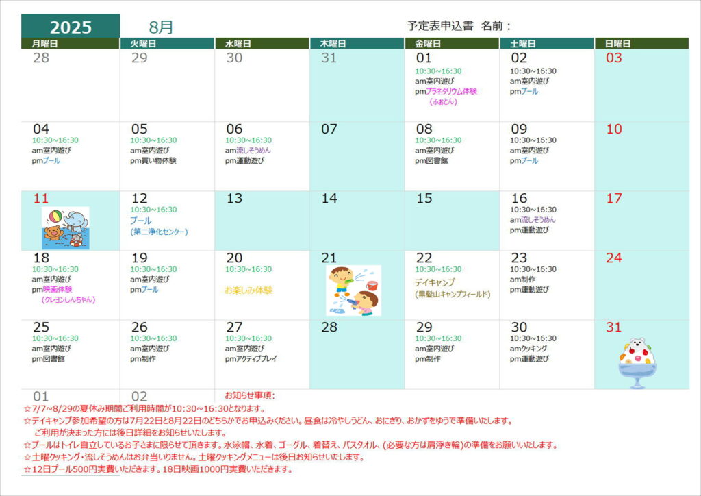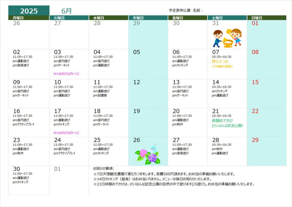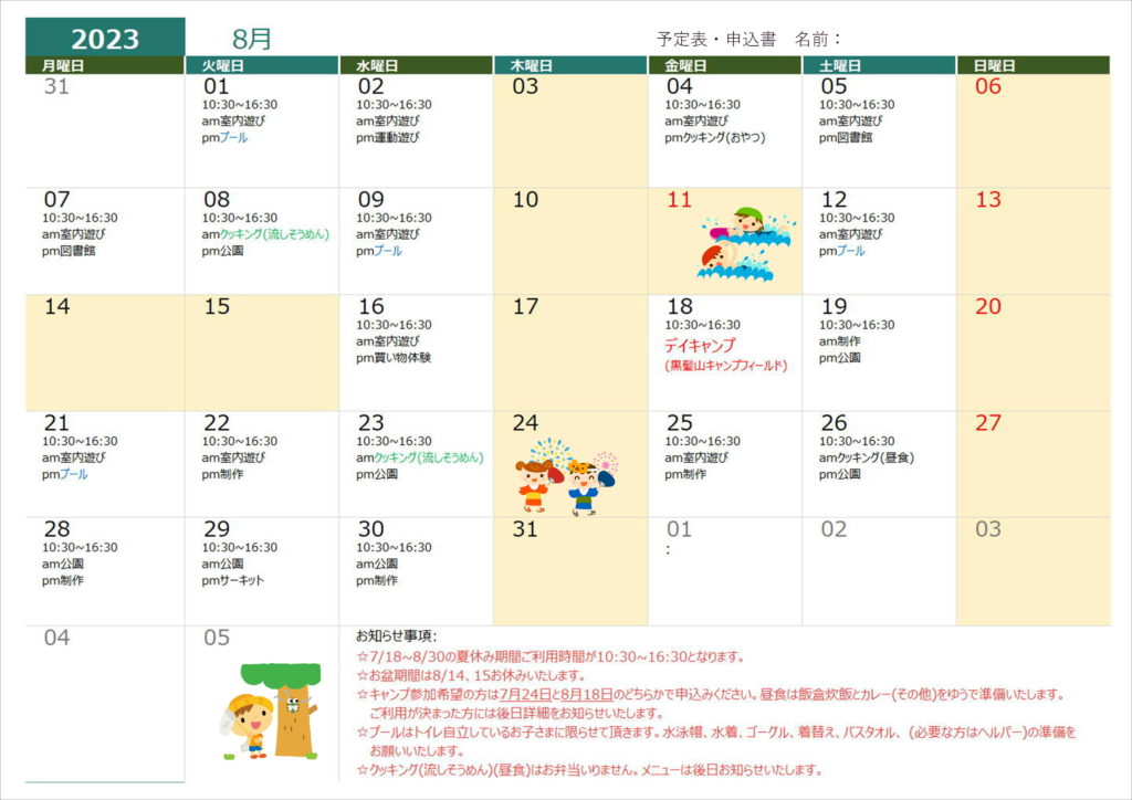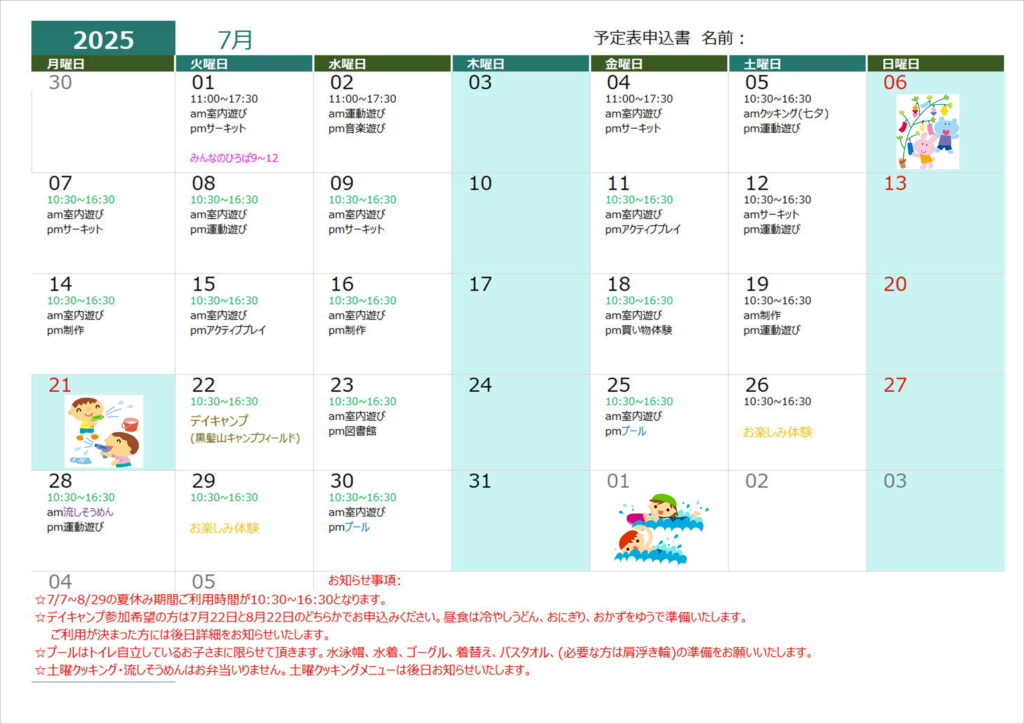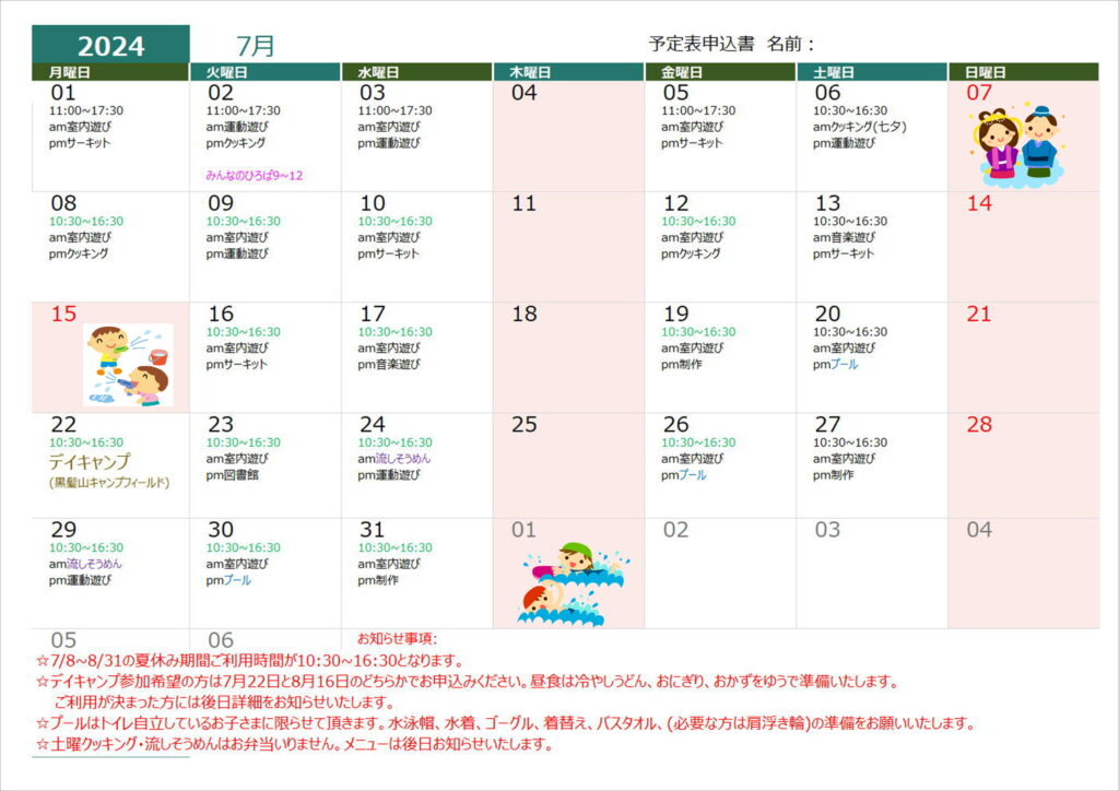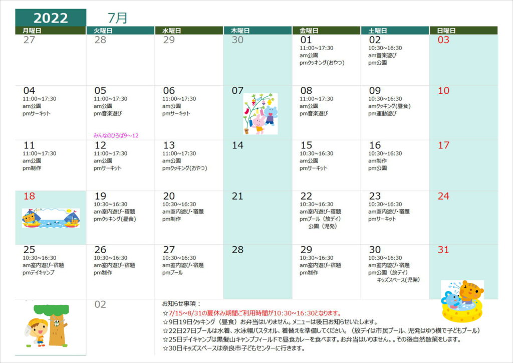 7月19日(火)クッキング(昼食)➡クッキング(おやつ)に変更します。
