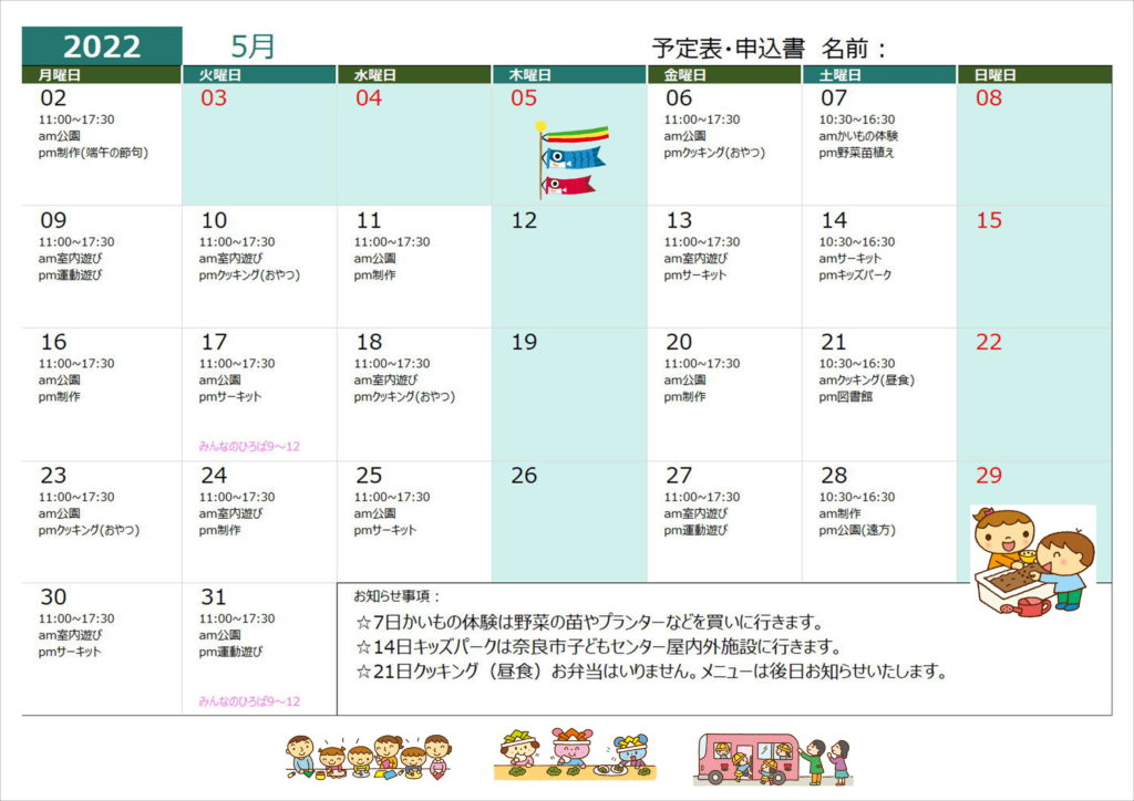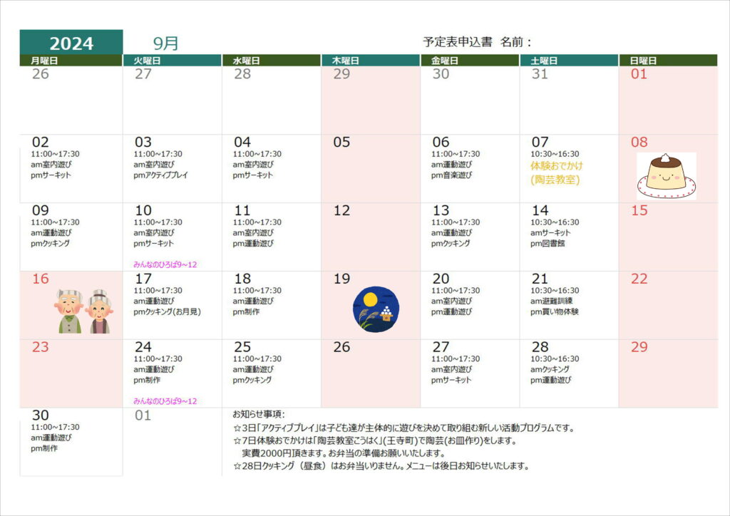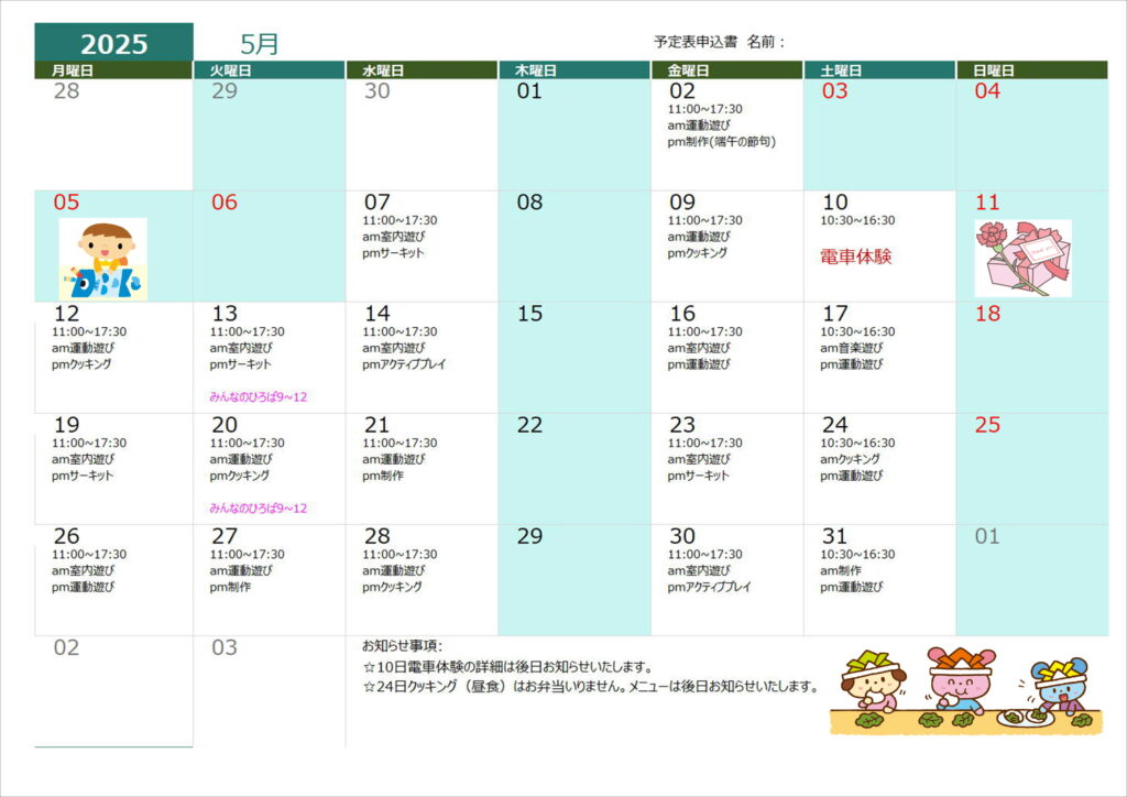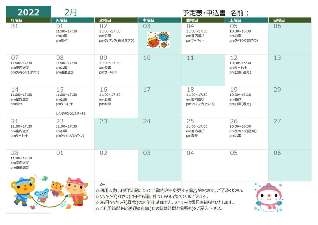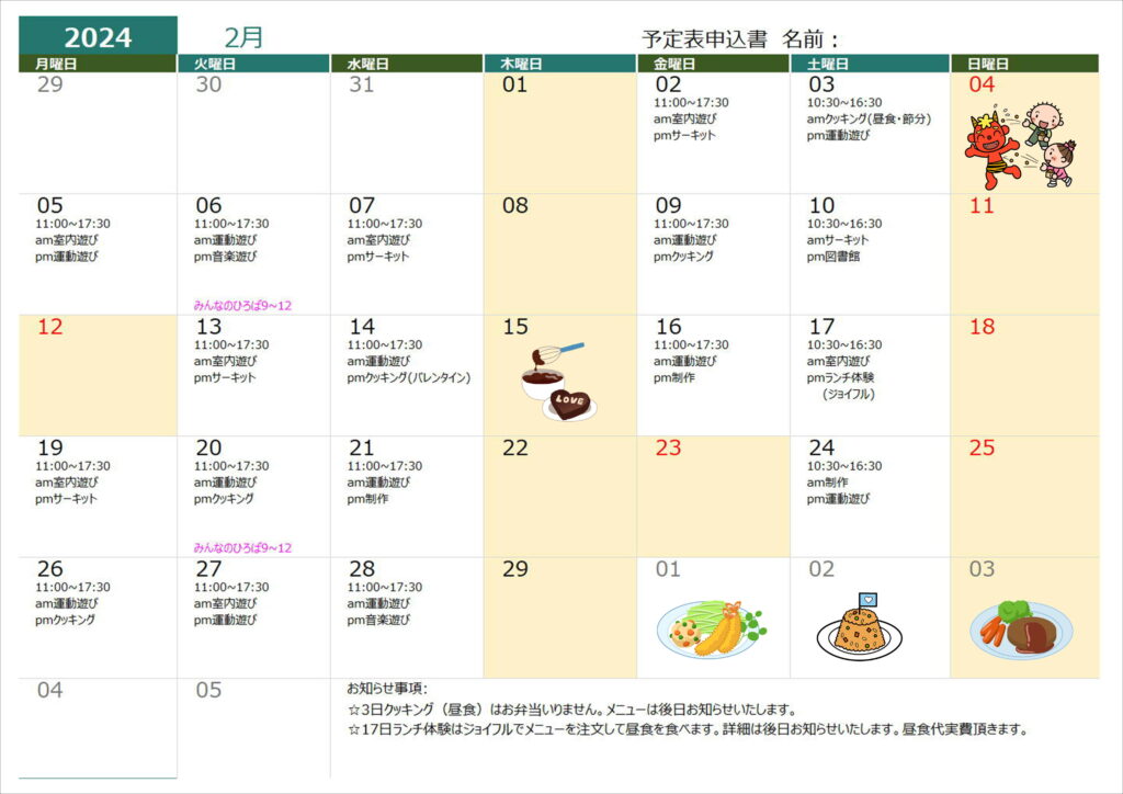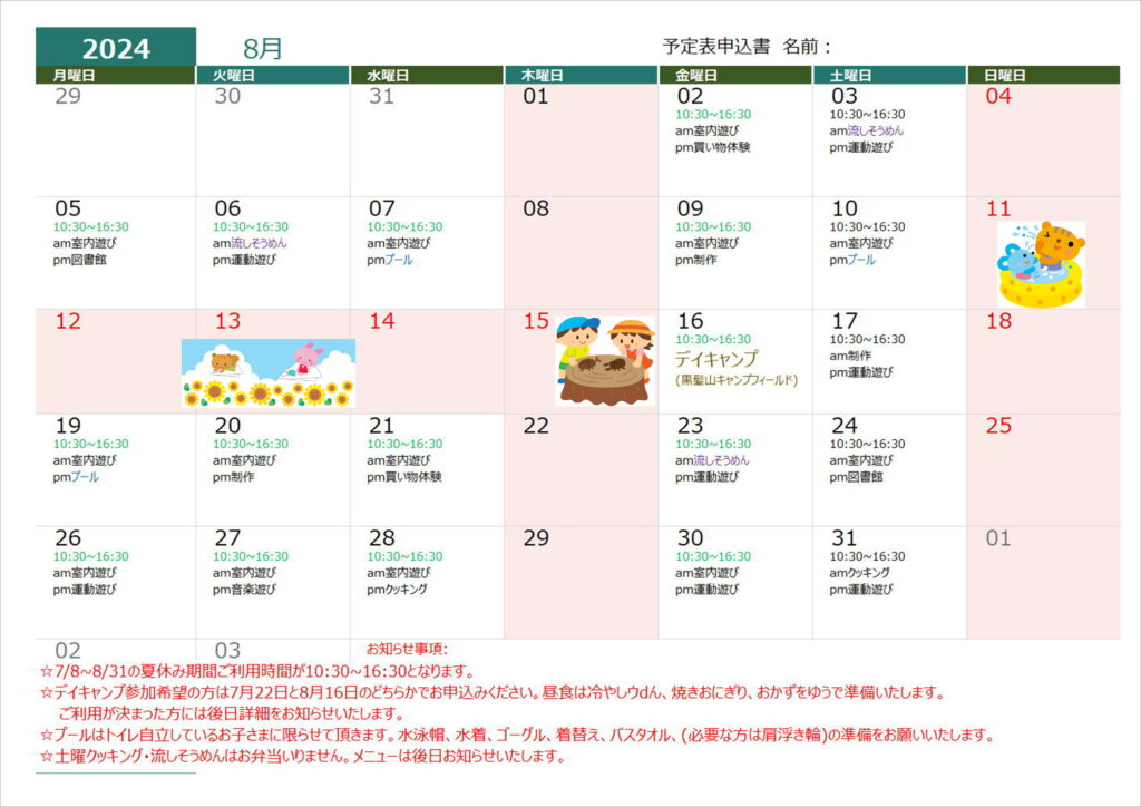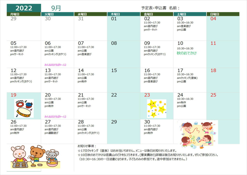 7月19日(火)クッキング(昼食)➡クッキング(おやつ)に変更します。