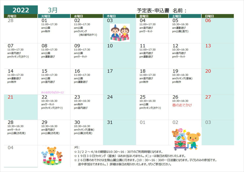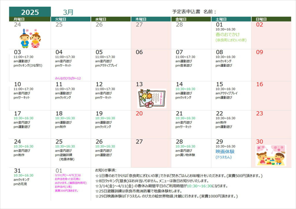 3月11日(土)春のおでかけの行き先を若草山➡飛火野広場・植村牧場に変更します。