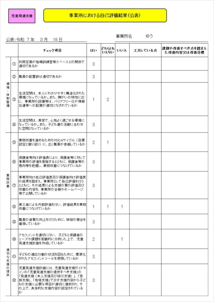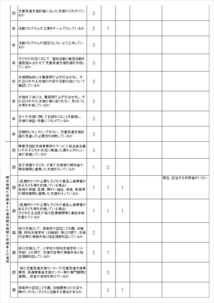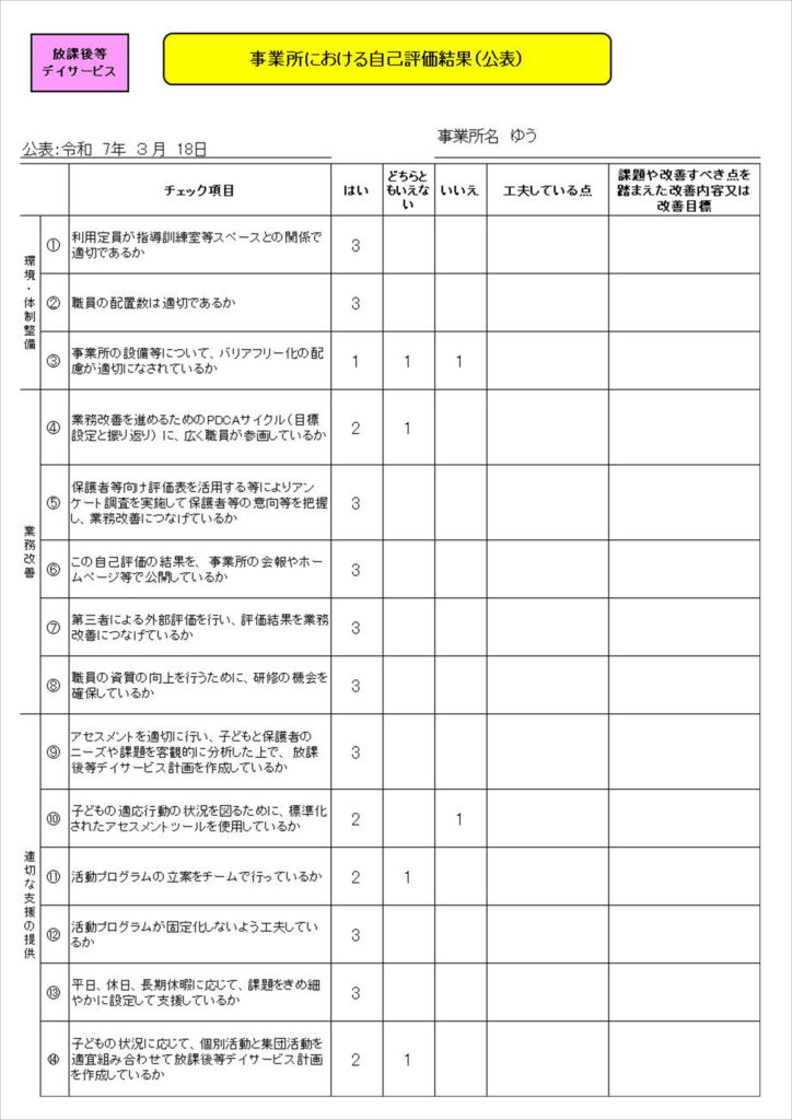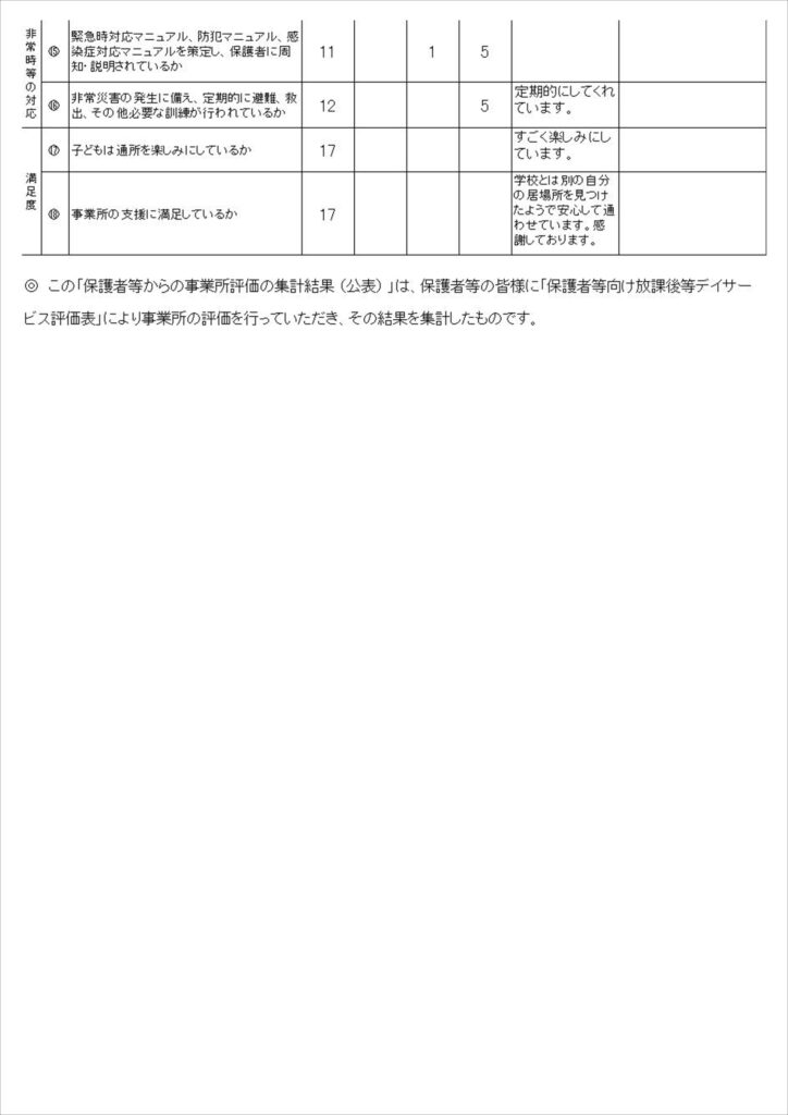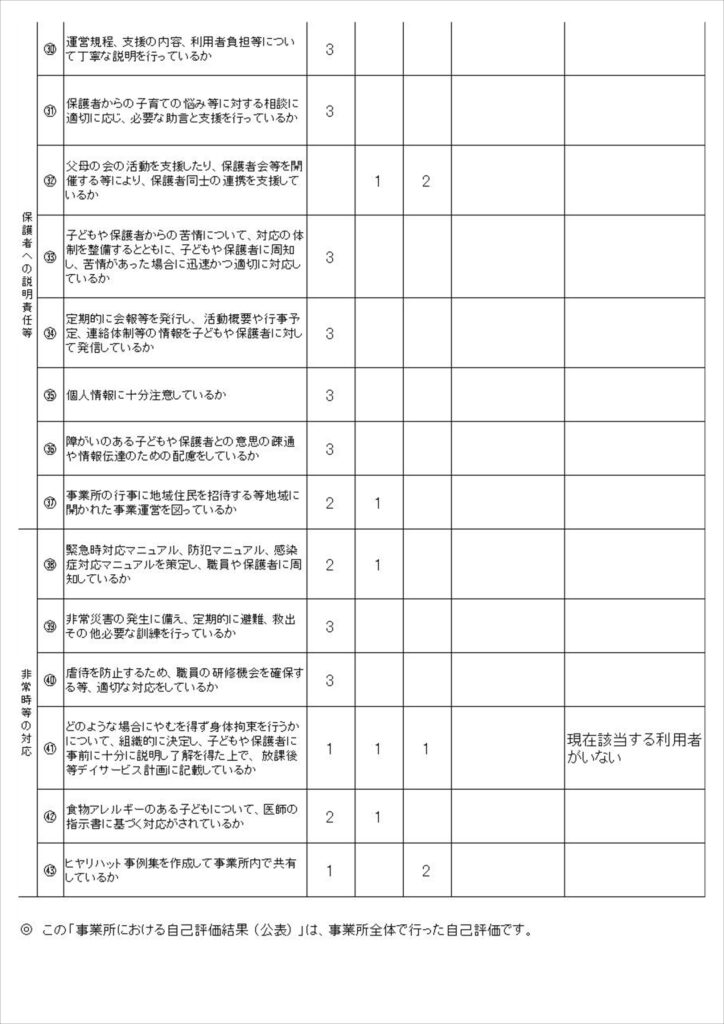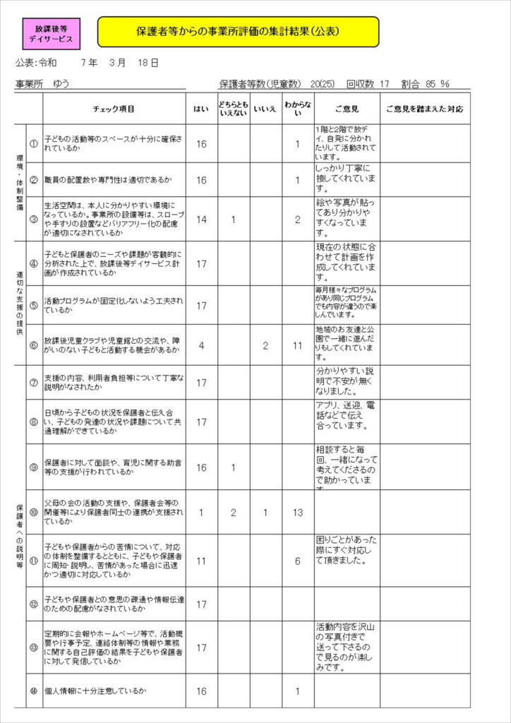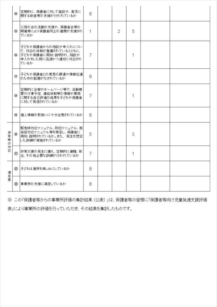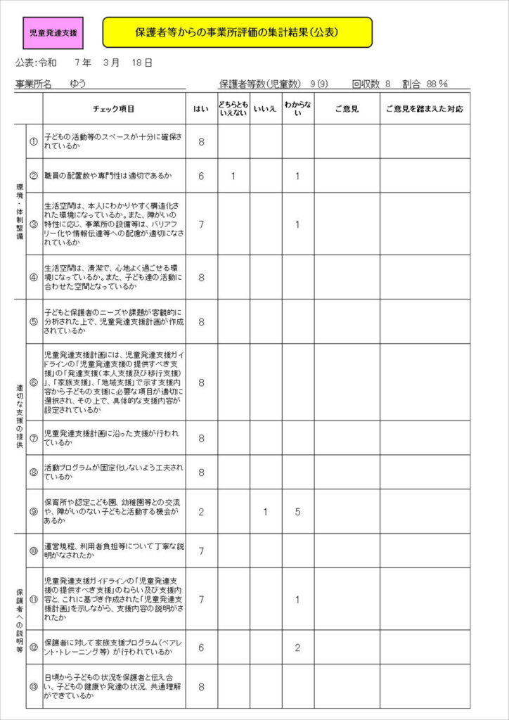 児童発達支援・放課後等デイサービスの保護者評価結果及び自己評価結果を公表いたします。