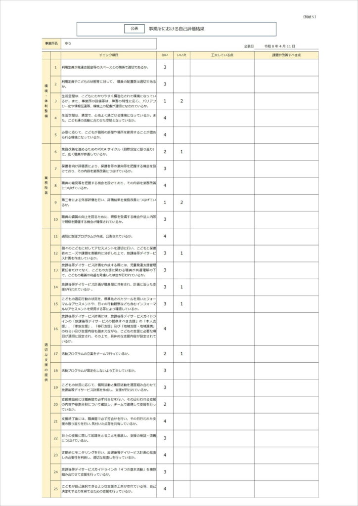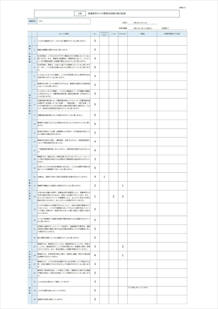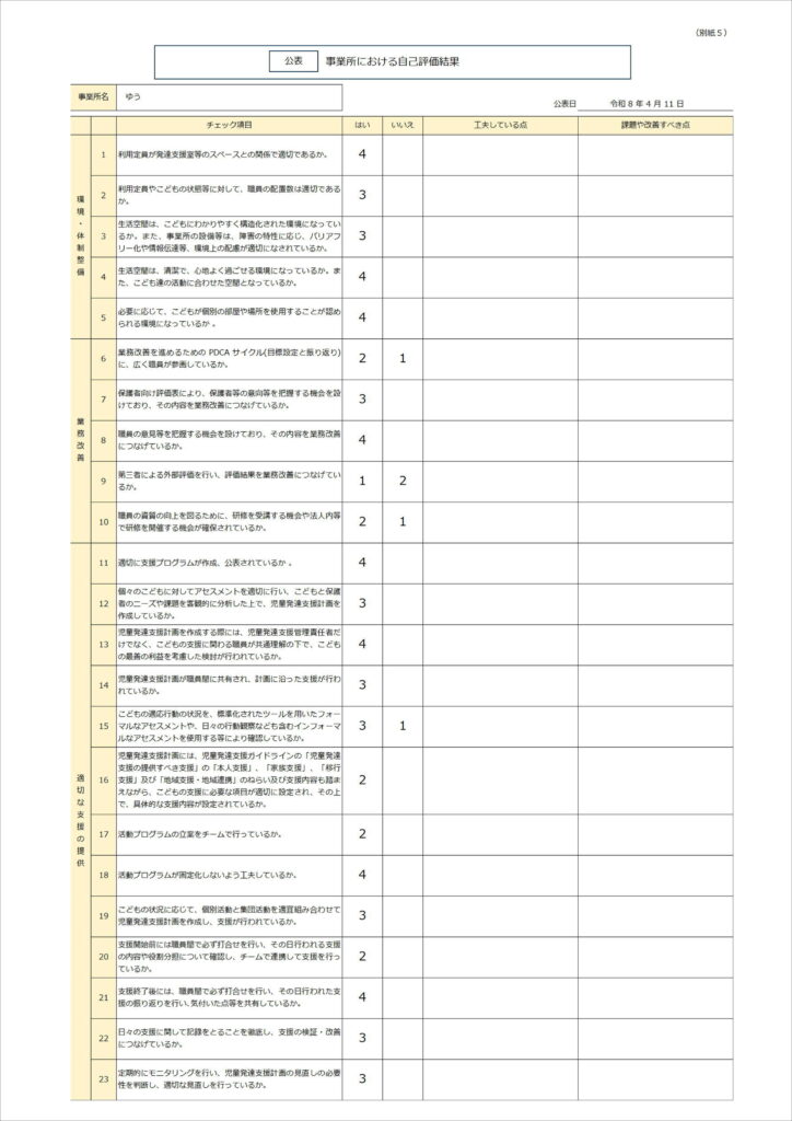 児童発達支援・放課後等デイサービスの保護者評価結果及・自己評価結果・自己評価総括を公表いたします。
