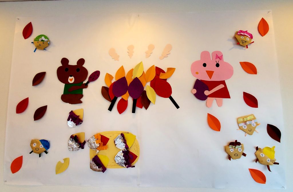 11月の壁面ができました。秋らしく「くまさんとうさぎさんの焼き芋パーティ」です!(^^)!くまさんとうさぎさん、いい味出てます!まわりの落ち葉とどんぐりくんたちもにぎやかで良いですね~。今月利用の子ども達にも作ってもらいましょー♪