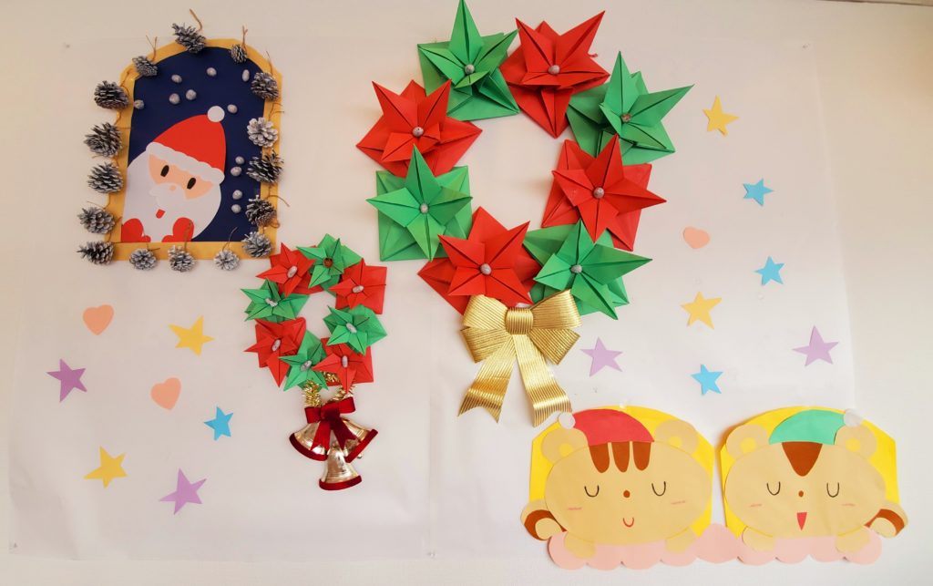 12月の壁面が完成しました~!真ん中に子ども達が折ってくれたポインセチアのクリスマスリースとプレゼントを楽しみにして眠っているリス姉弟と窓からやってきたサンタさんです(^_-)-☆白く塗られたどんぐりとまつぼっくりが冬感出てますよね~。子ども達が貼る場所を考えてくれたり、ひもを巻いて結んでくれました!