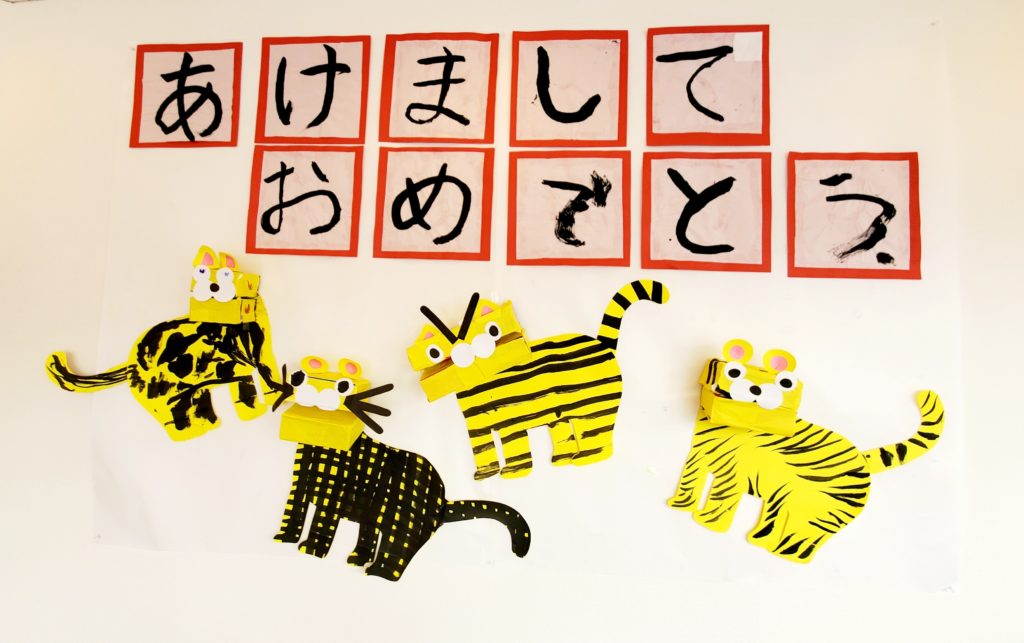 1月の壁面ができましたよ~。空き箱に黄色の折り紙を貼ってから顔のパーツをくっつけました。体の模様は筆と墨で塗ってくれました。顔にも模様にもめちゃくちゃ個性が出てるな~~。半紙に一文字ずつ字を書いてもらって「新年ごあいさつ寅年壁面」完成で~す(*^-^*)