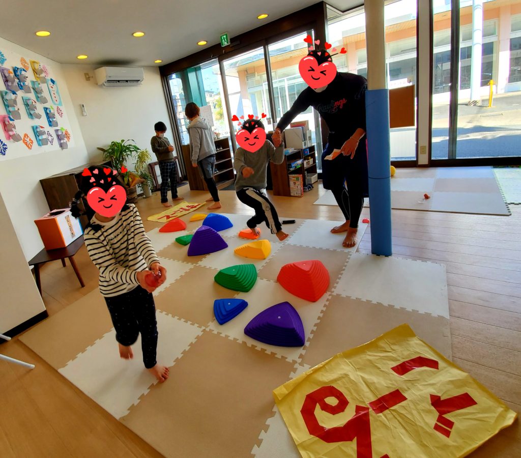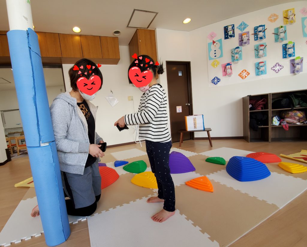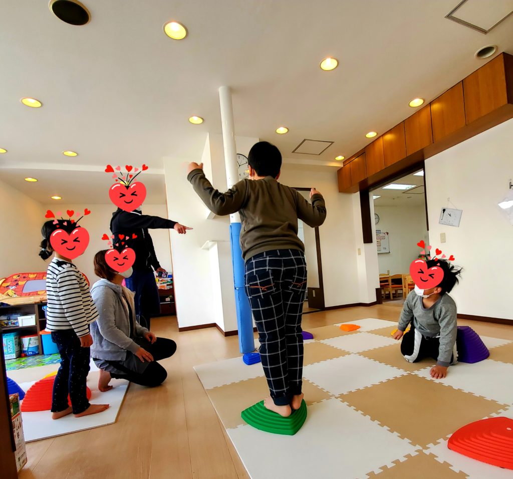 サーキット活動を行いました!大・小・高・低の違う形をしたバランスストーンを円になるように置いて音楽がなりだすと。。。「おっとっとー💦」「今の落ちてへん、セーフ!」と両手をグルグルさせてバランスを取りながら次々に跳び乗り上手に前に進むことができました😄音楽がピタッと止まるとストーンの上でスト~~ップ!「落ちちゃった~~(T_T)」実は止まる時が一番難しいんですよ。「次はがんばるぞー٩( ”ω” )و」