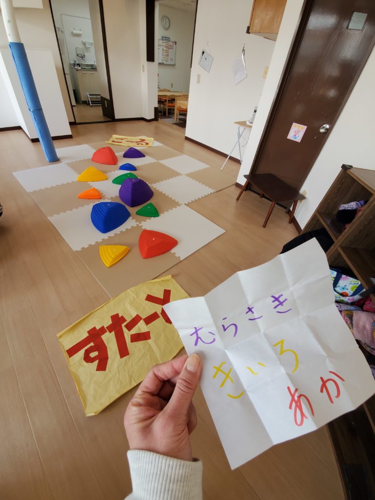 続きまして、ガチャガチャくじ引きで(色限定、形限定など)引いたお題の通り進んでゴールにたどり着こう!!「すきないろでいこう!」が出たら「やったー当たりや(≧▽≦)」ゲーム性があるとみんな楽しそうに取り組んでくれるなぁ。