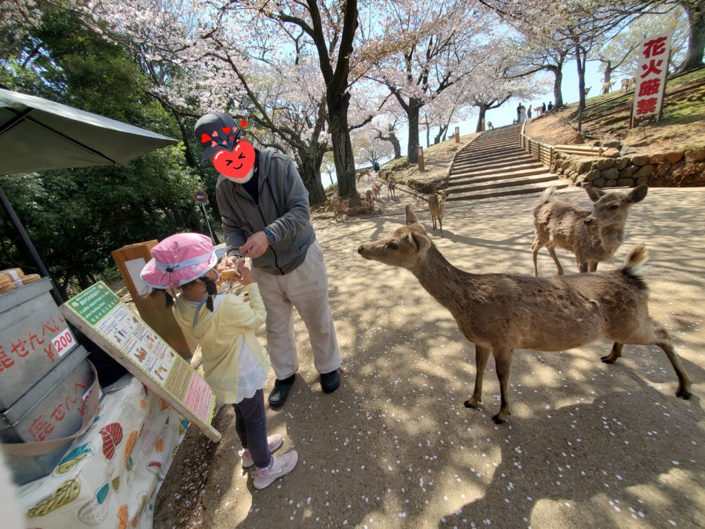奈良公園周辺におでかけに行ってきました(^^♪若草山山頂でお弁当を食べ、気持ちの良い風を感じながら奈良市の街を一望し、鹿さんに鹿せんべいをあげてきました🦌鹿せんべいの封を開けると同時に集まってくる鹿さんに怖々ながら「待っててー」「さっきあげたでしょ」「おしまいもうないよー」と声をかけてくれていました🦌🦌🦌