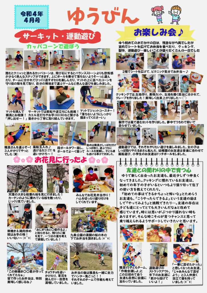 「ゆうびん」令和4年4月号が出来ました!「友達との関わりの中で育つ心」初めての体験や、前に上手くいかなかった体験って、積極的に行動できないことがよくあるけれど・・お友達と一緒ならできちゃうこともよくあります(#^^#)