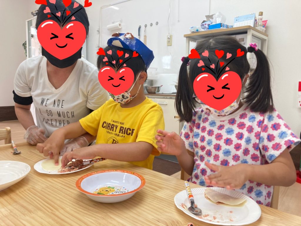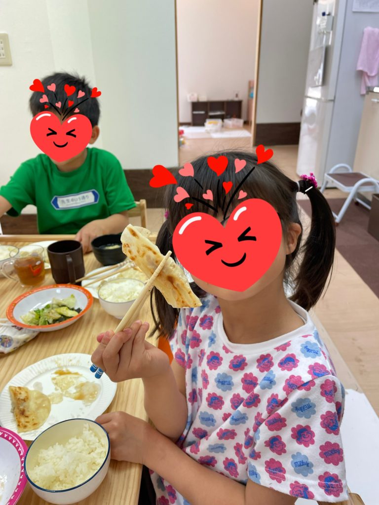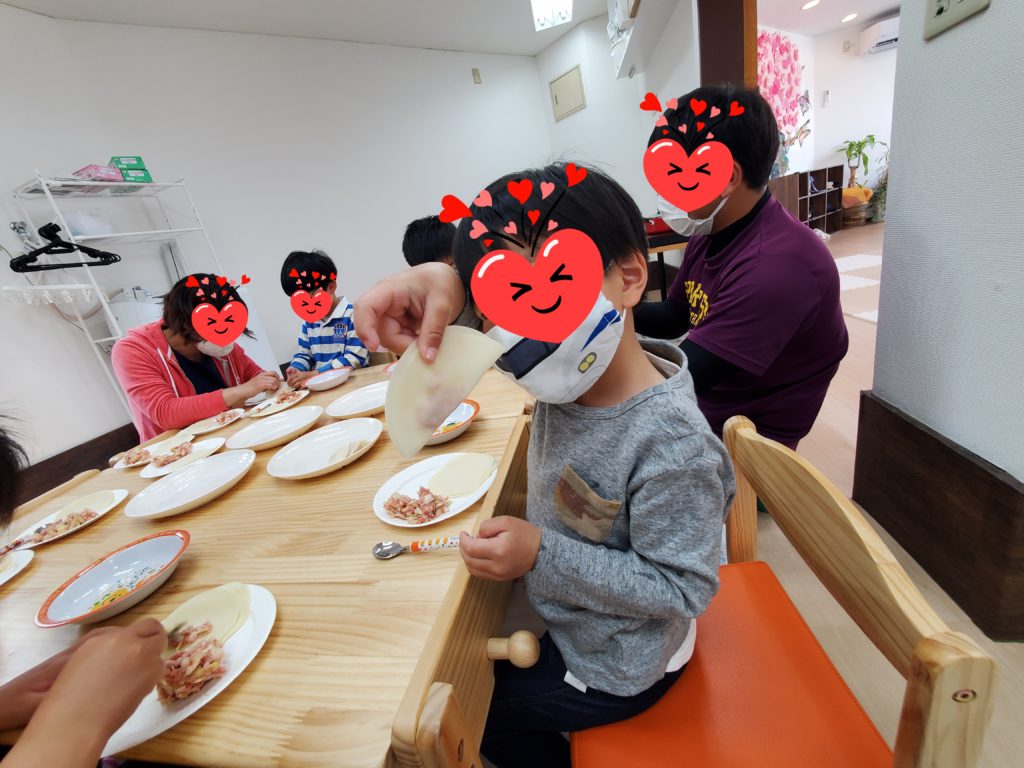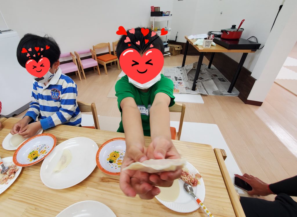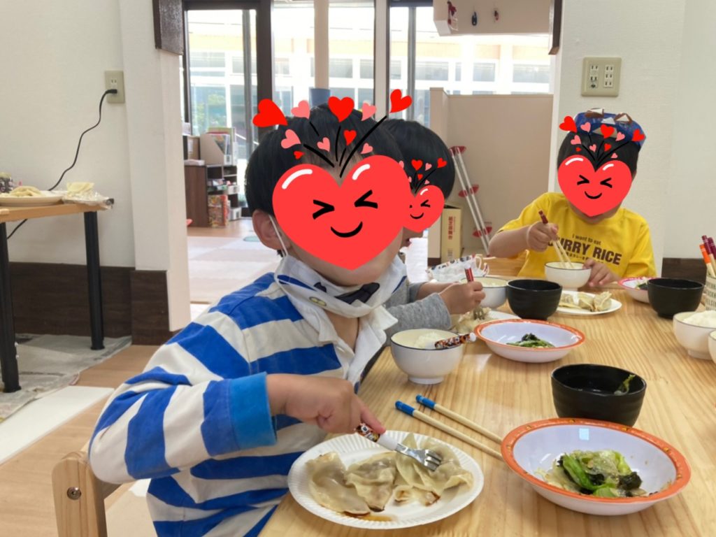 ホットプレートで焼けたかどうかフタを取る時には「3、2、1~!」の掛け声も上がり、とっても良い匂いのギョーザ出来上がりです☆今まで苦手だった子も、おともだちが「おいし~よ~」と食べてる様子を見て、一口パクっ・・二口パクっ・・丸々1個食べれちゃいました🙆