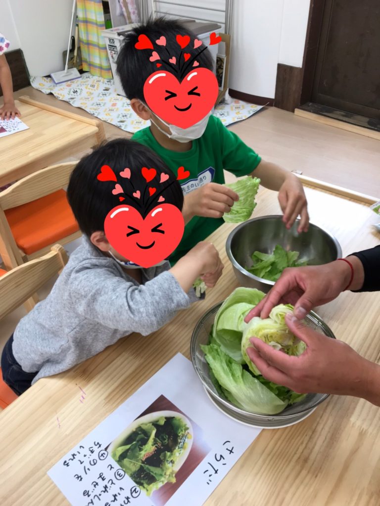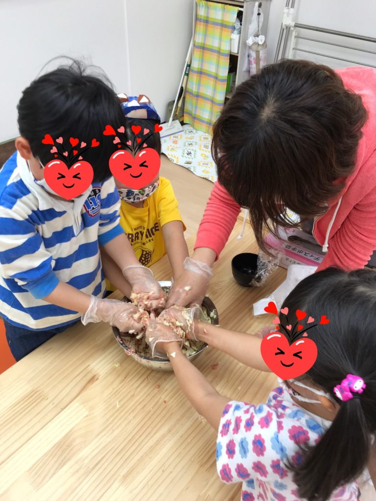 昼食クッキングで「ギョーザ」「レタスと卵のスープ」「チョレギサラダ」を作りました(*^_^*)キャベツやレタスを切って(ちぎって)材料の準備をした後はギョーザの餡作りに挑戦!お肉とキャベツと調味料を混ぜて「おいしくな~れ♪」とこねてくれました☆
