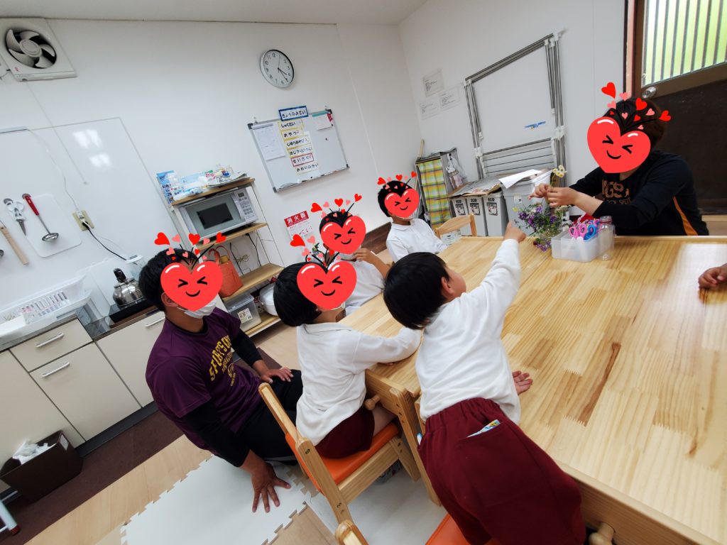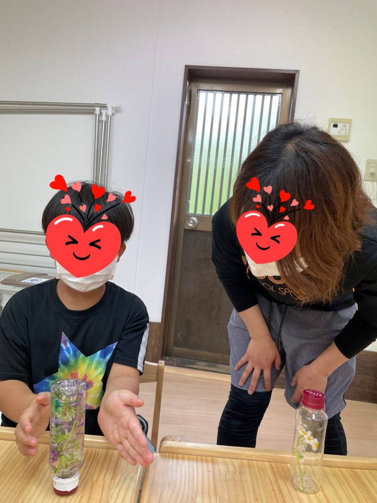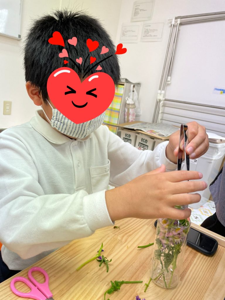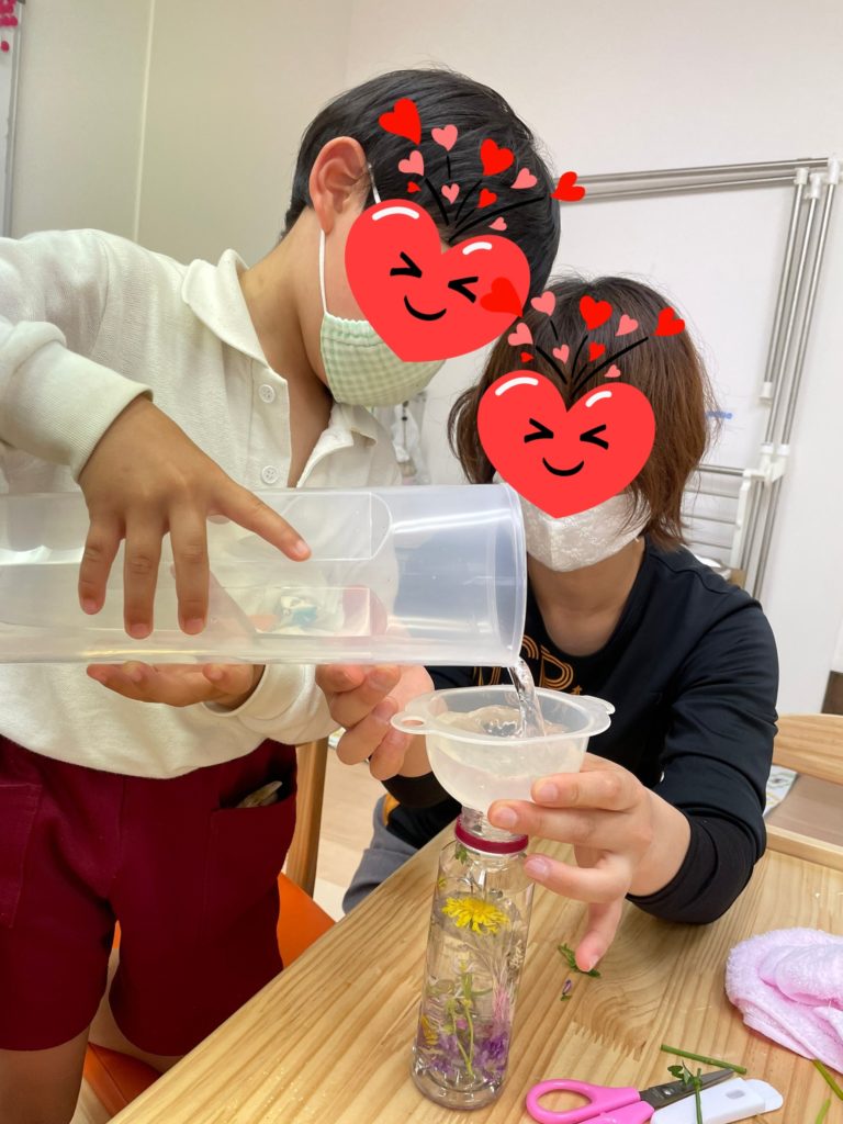 制作で「ハーバリウム」を作りました🌼テーブル一面にお花を広げて「どの花にしよっかな~。」「むらさききれい!」「ふわふわのもあるよー。」ボトル容器に入るように茎を切るよ~。ハサミ上手に使えるかな?うまく入れるにはピンセットも使ってみてね。最後にお水を満タン入れてふたを閉めたら完成です☆お花も大好き男子たちでした💛