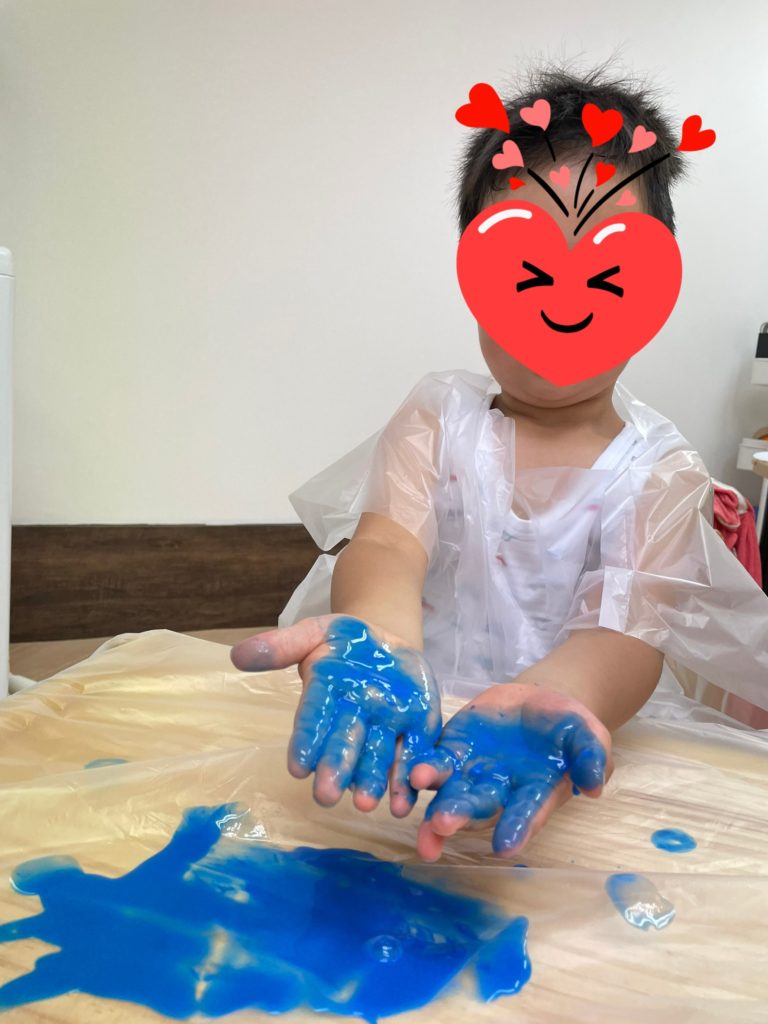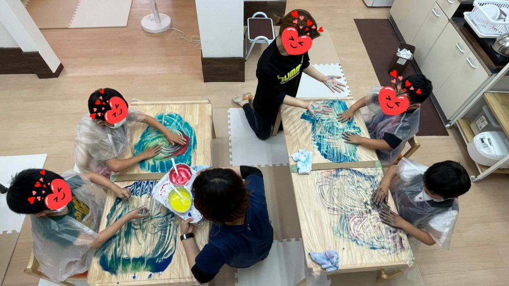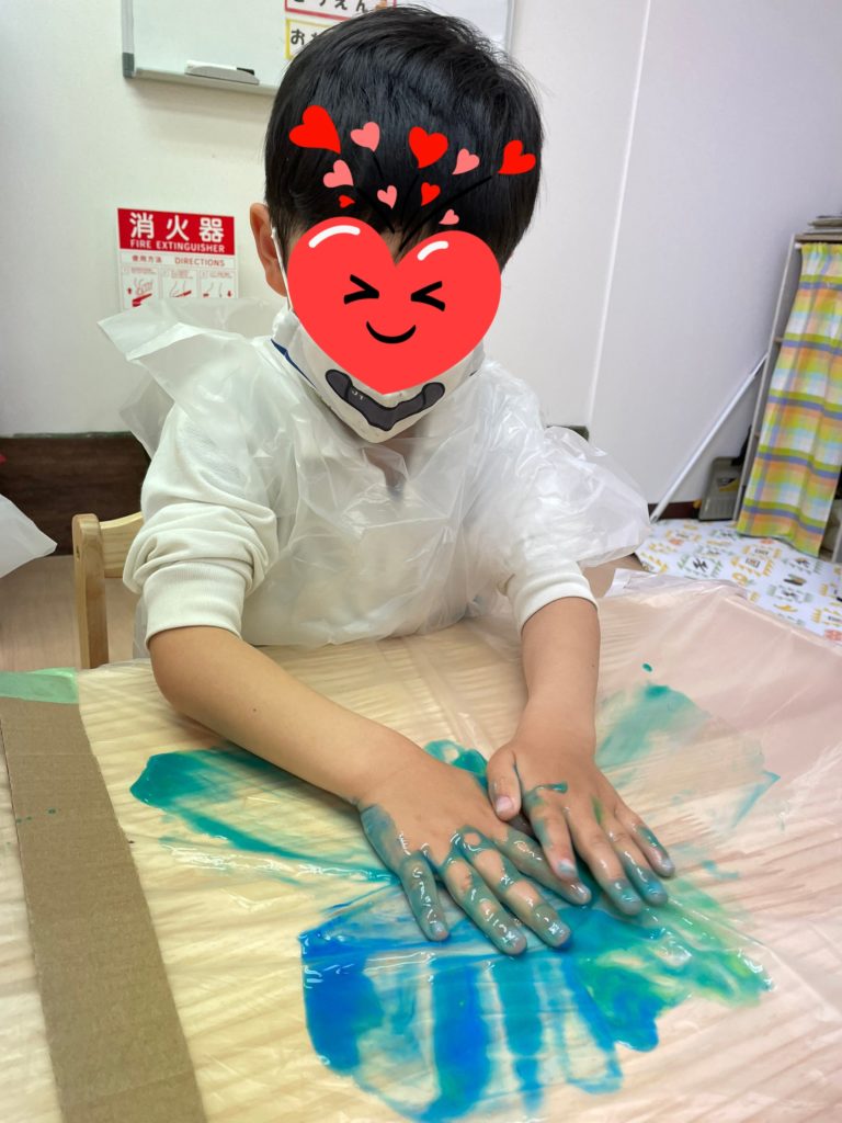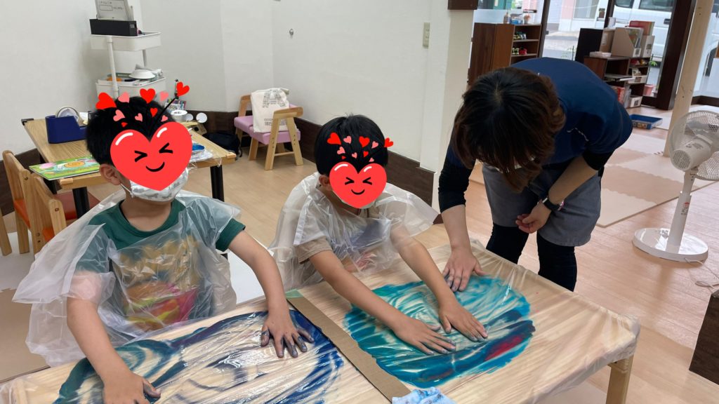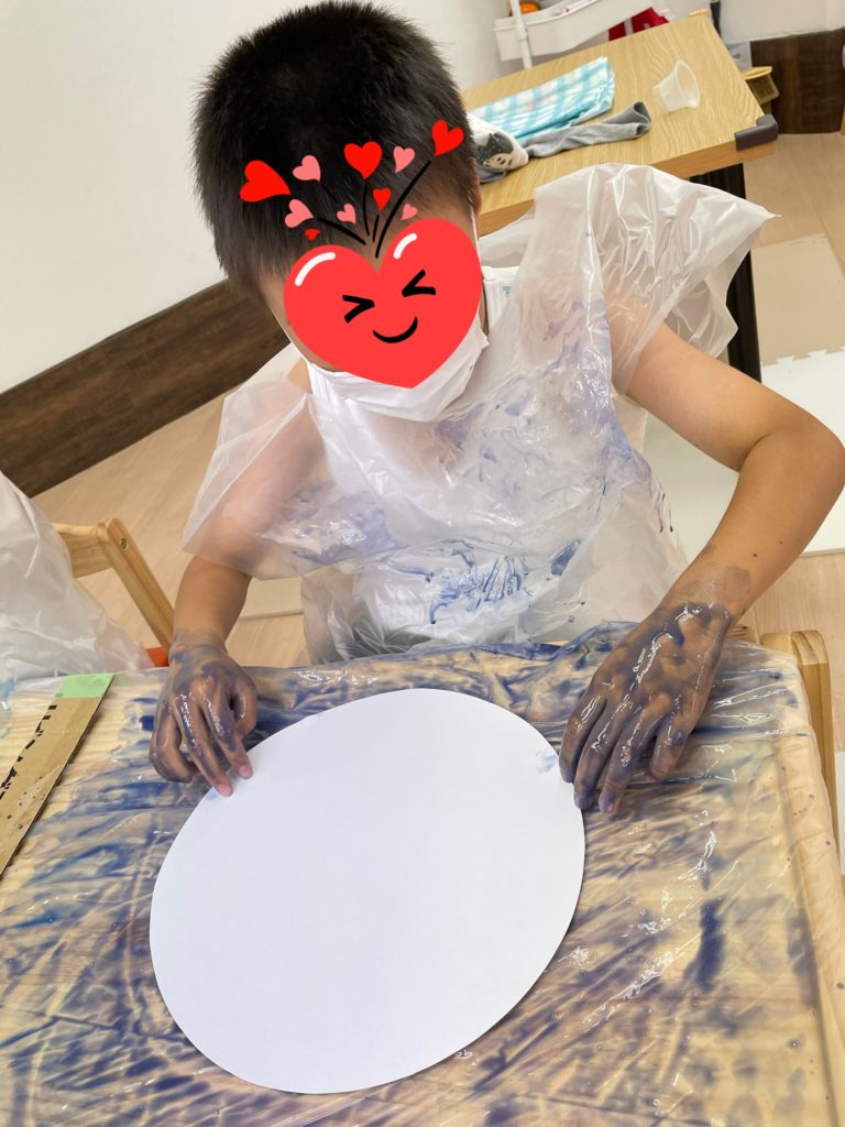 6月の壁面制作スタート!!指絵の具を使ってカタツムリを作りました👉色を自分で選んで手のひらで混ぜてみよう!いつもの絵の具と違うトロトロした感触は小麦粉を溶かしてあるから・・・指で描きやすくって色うつりが良いそうです☆冷たくって気持ち良かったり握手して感触を楽しんでいます。テーブルいっぱいに塗り描いた模様を上からスタンプした丸い画用紙はカタツムリの殻になりました😄