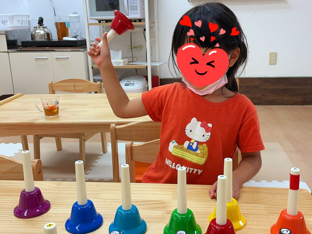 音楽遊びでハンドベルを鳴らしてもらいました🎵体全体を使って一生懸命振ってくれている姿がかわいい🥰