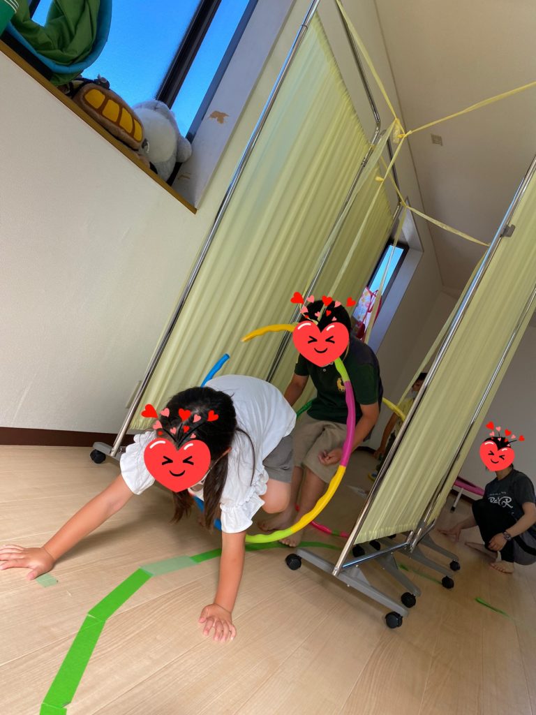 寝ころんだ職員さんを子ども達が力を合わせてひっくり返す「お煎餅ひっくり返しゲーム」力の入れ方とタイミングが重要です(´っ・ω・)っ両手両足を使ってのフラフープくぐりも工夫して作られていていいね👍
