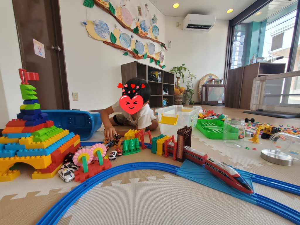 ブロックとプラレールを自由につなげて街を作っています🚋そんな風につなげるんだ~と職員さんが感心するくらい想像力がすごい😧