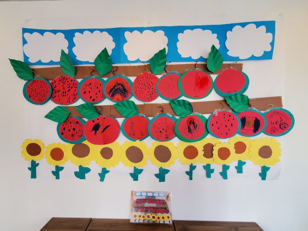 7月の壁面完成です!空・スイカ・ひまわり 真っ直ぐな夏のイメージですね~😝貼り付けも子ども達がやってくれました♪