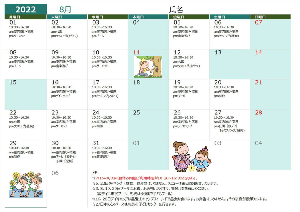8月の予定表が出来ました🌞7/15(金)~8/31(水)の夏休み期間ご利用時間が10:30~16:30となります。また8/13(土)~15(月)はお盆休みです。活動プログラムなどお問い合わせありましたらご連絡ください🙋