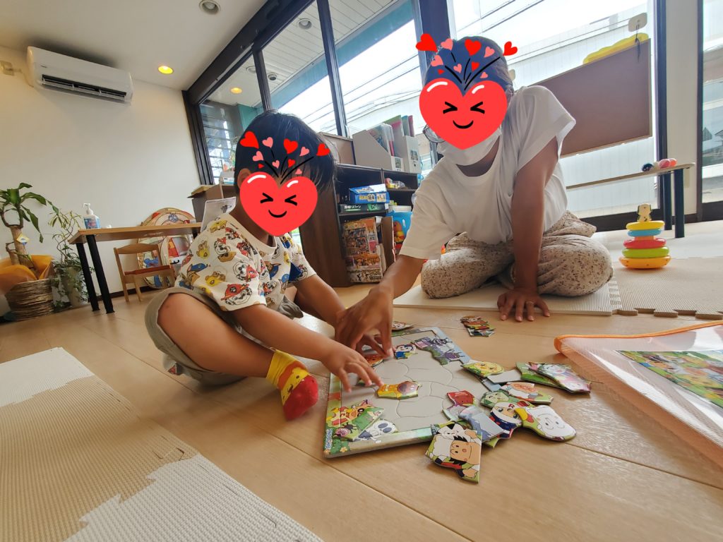 ひとつずつピースを手に取ってお母さんに見せて「これどこ~?」と会話しながら楽しいパズルの時間を過ごしました(^_-)-☆
