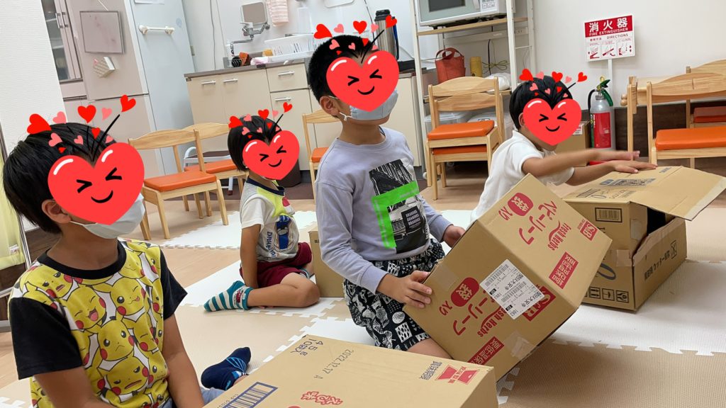 音楽遊びでダンボールの太鼓を叩いて遊びました(^^♪最初は力いっぱい打っていたおともだちも次第にお気に入りの曲のフレーズのリズムで打ったりといろんな叩き方をしていました。みんなの前でお手本を叩くのが嬉しくて「もう一回する~」とリクエストもしてくれていました(^_-)-☆