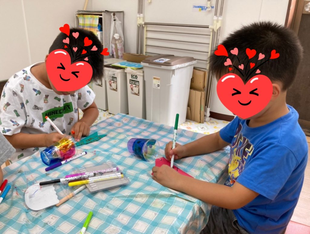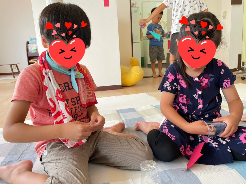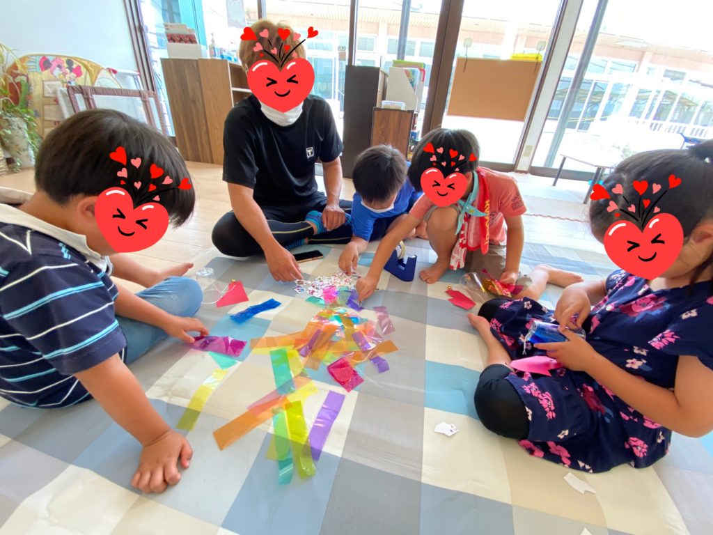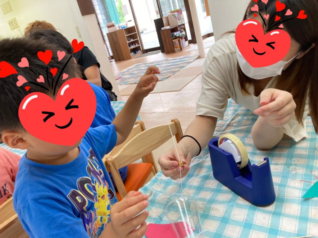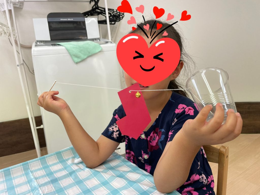 8月の壁面制作スタート!プラコップと鈴と短冊をつなげて「風鈴」を作りました🎐小さい穴にタコ糸を通すってこんなに難しかったっけ?くらいみんな苦戦していました💦💦基本の形ができたら好きなシールとカラーセロファンを選んでプラコップに貼り付けて短冊に字や絵を描いたらオリジナル風鈴完成です😊