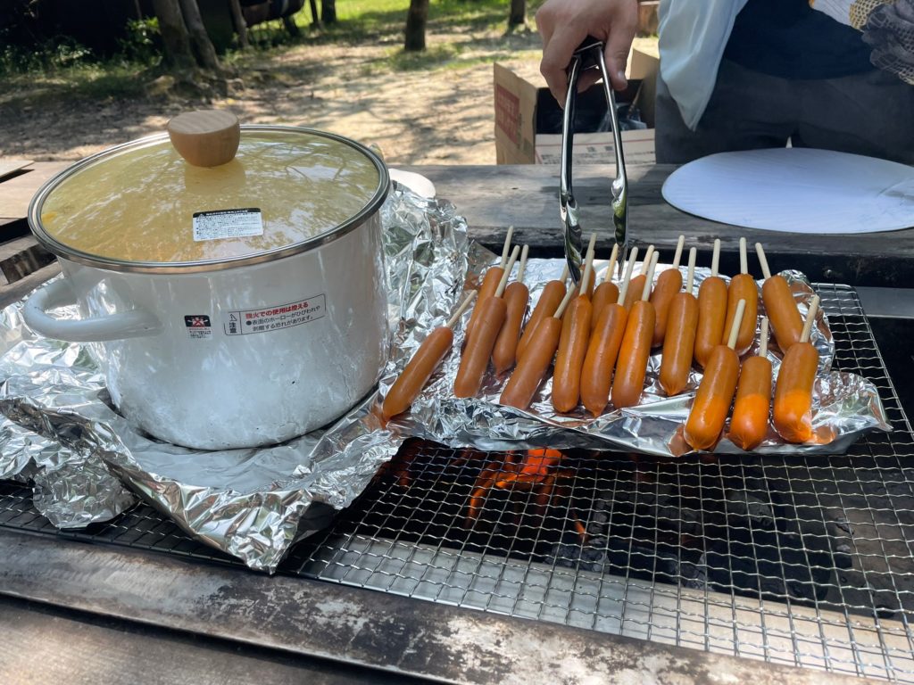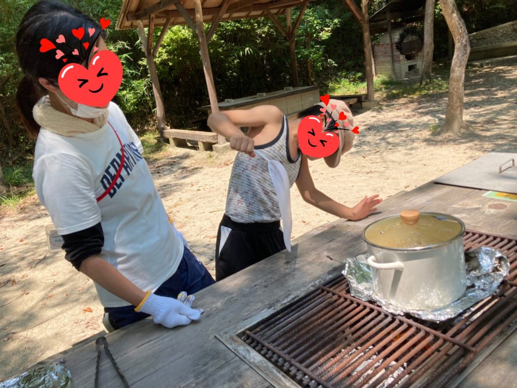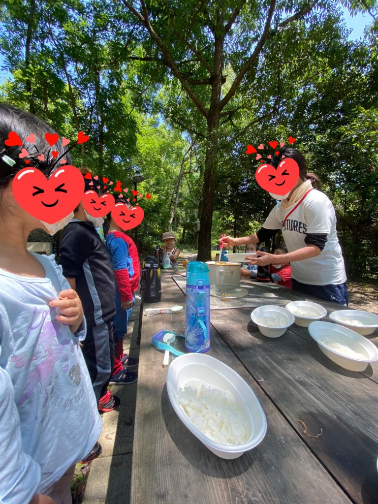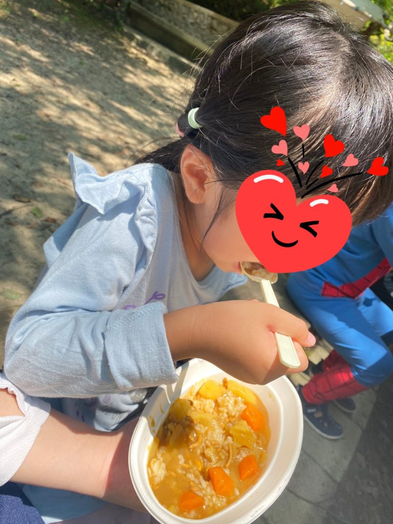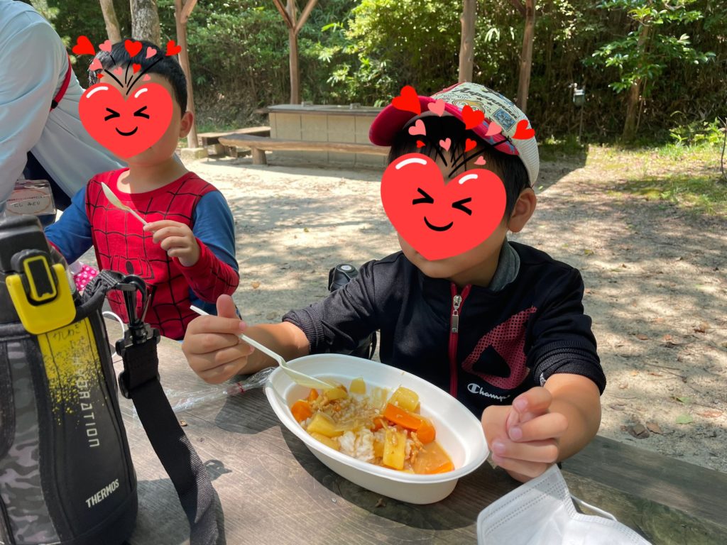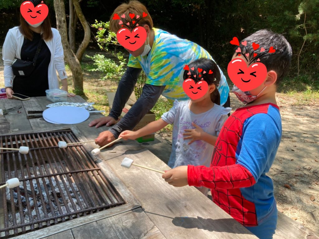 黒髪山キャンプフィールドに行ってきました~😄まずは全員揃ってオリエンテーション!ひとりひとり地図を渡して「カレーが温まるまで探検に行ってきて~(^^♪」「お腹すいたぁ💦」と戻ってきたらカレーとフランクフルトで昼食です🍛食べるまではお家と違うカレーとフランクフルト食べられへん(T_T)と少し戸惑ってた様子でしたが、おともだちの中の1人が「美味しい!」と声があがると次々みんな食べ始めてくれました👏デザートにマシュマロを棒に刺して炭火でじっくり焼いていただきました😊