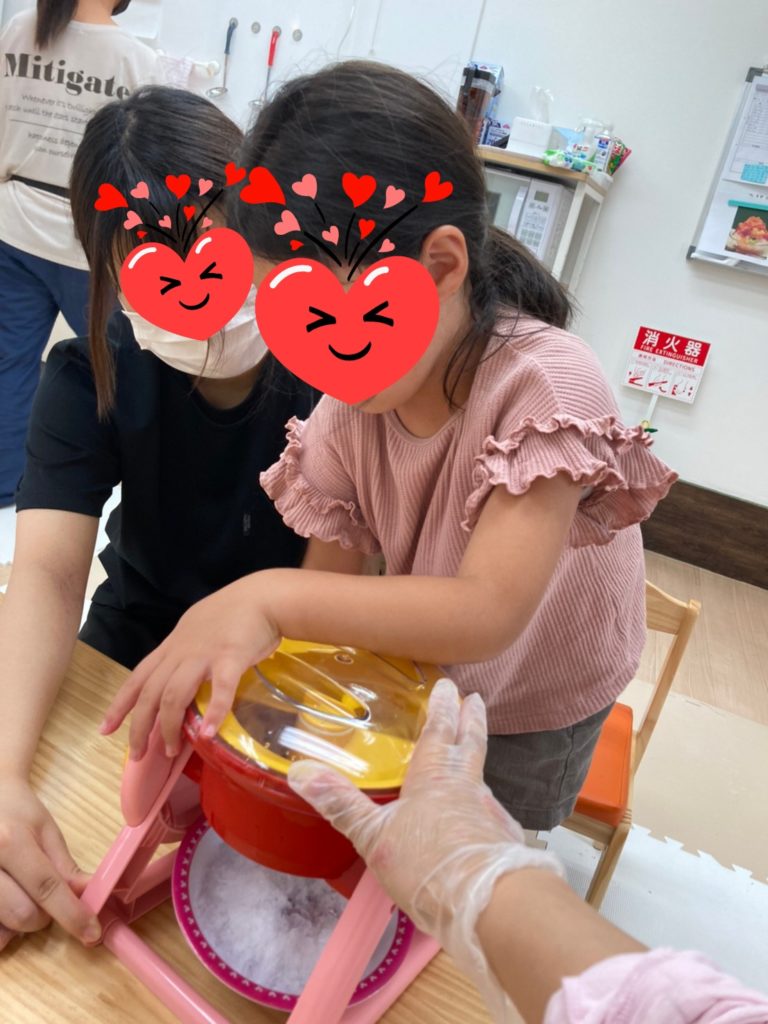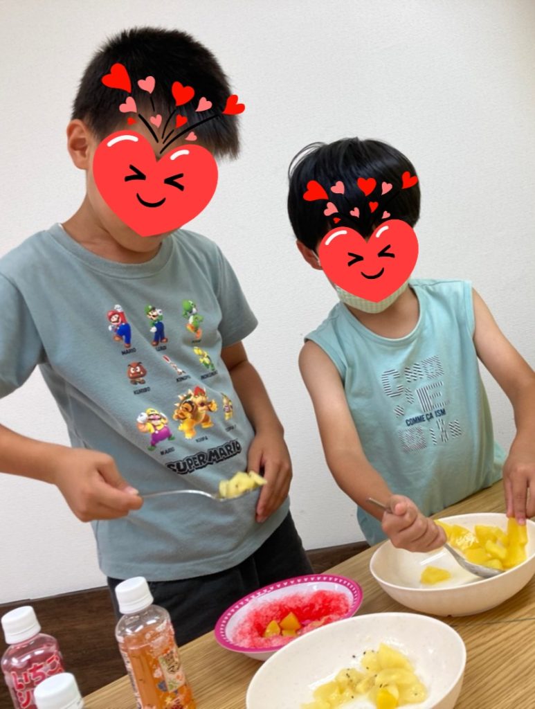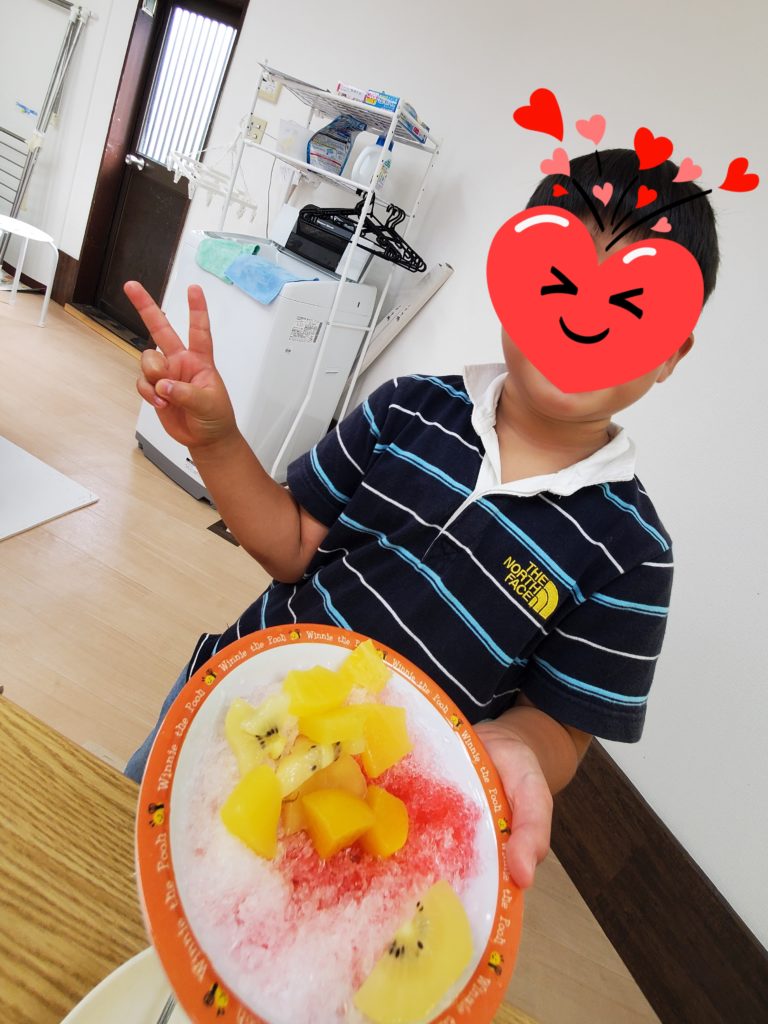 夏休み中盤٩( ”ω” )و暑いから💦やっぱりお外は暑いから💦💦書道美術館でクイズ大会に参加、音楽遊び、サーキット、そして夏といえばかき氷🍧蜜をかけてフルーツをトッピングしてお口ひんやり~😋