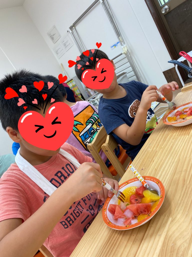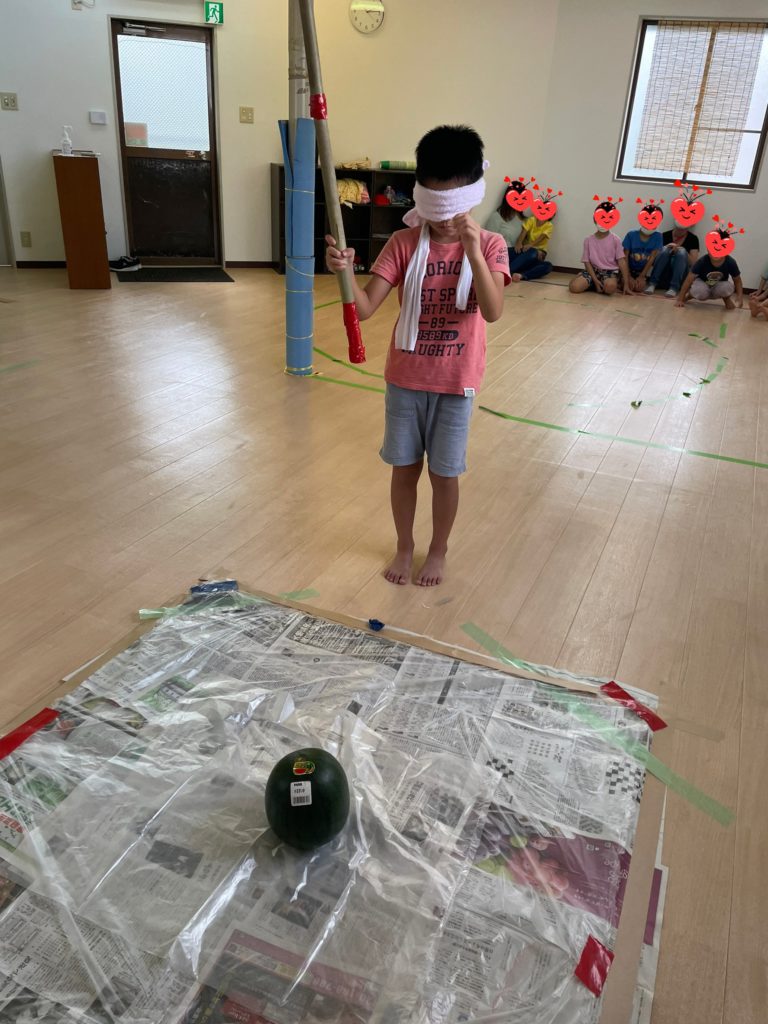 室内ではありますが「スイカわり🍉」にも挑戦しました!「みぎ、みぎ!」「ちょっとまえ!」とみんなの声を聞きながら少しづつスイカに近づいて竹の棒を振りおろしてくれました。「おしい~~」が続いてなかなか割れなくても「次は僕の順番!」とやってやるぜ感がみなぎっていました😝