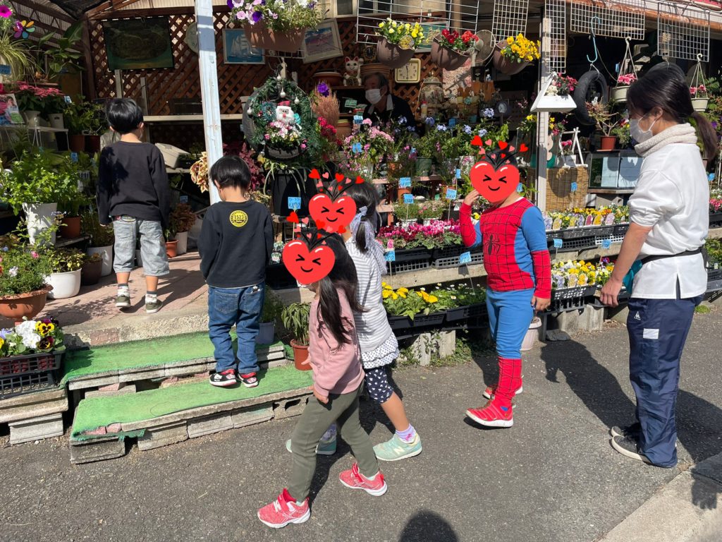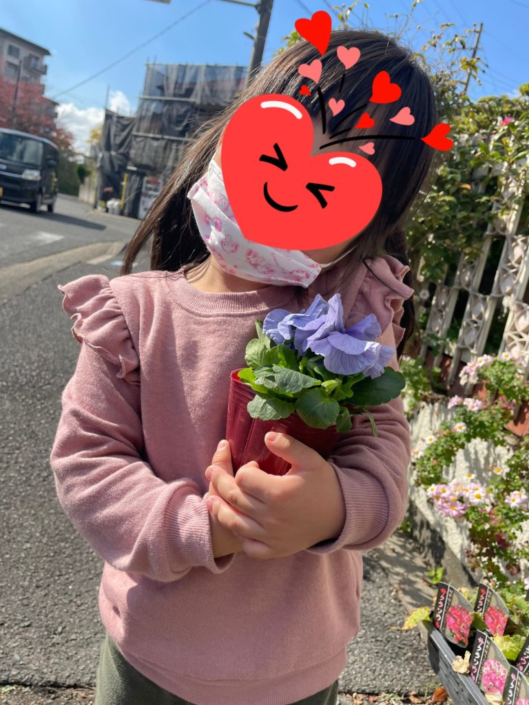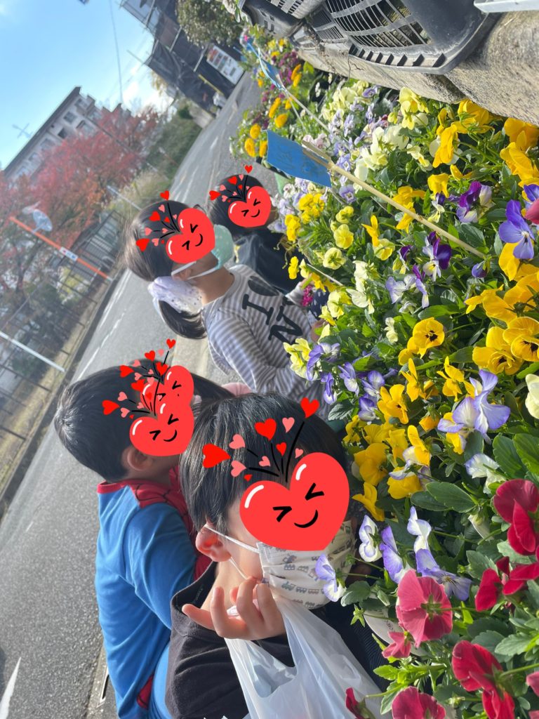 お花屋さんにお花を買いに行きました👣「値段を見ながらポットに入っているのを選んでね~。」と出発前にお話していた事をちゃんと覚えてくれていました🥰赤や黄色や紫のお花を1つずつ選んでお店の方に渡すと1人ずつ袋に入れていただき大切に持って帰ってきました👣
