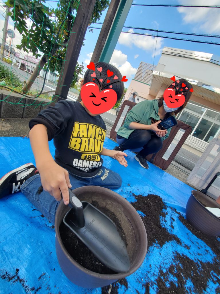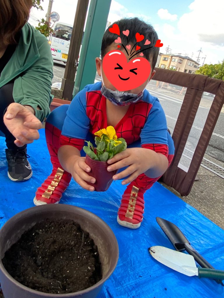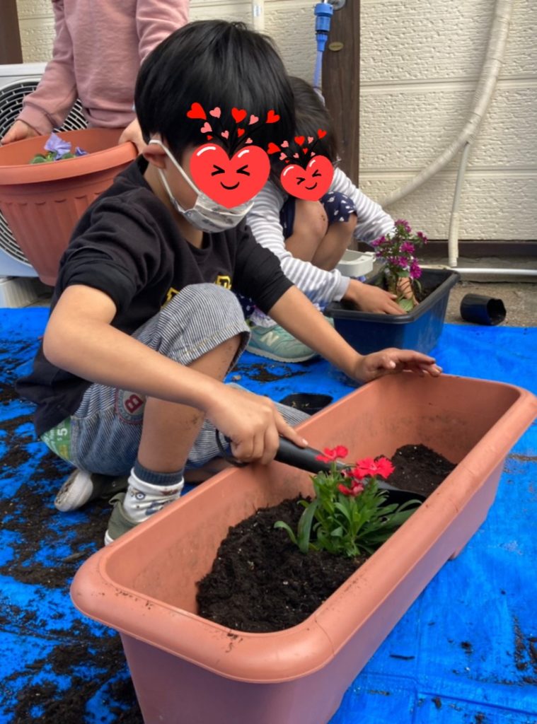 持ち帰ったお花はプランターに植えてもらいました🌼まずは敷石を敷いてそれから土をスコップで入れていよいよ自分で選んだお花を植えていきます😊折れないようにポットからそ~っと出したらやさしく土をかけて「大きくな~れ!」とお水をあげました(^_-)-☆