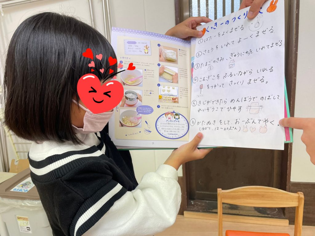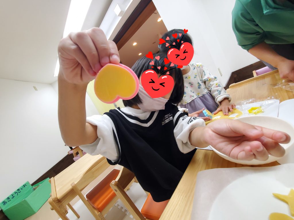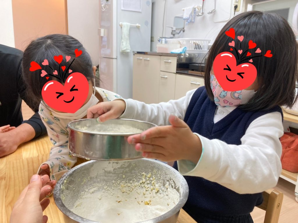 クッキングで「クッキー」を作りました🍪作り方を教えてもらったら粉をふるって材料を混ぜて型抜きできたらオーブンで焼きましょう😚「焼けてるかなぁ?」「あと何分でできるの?」みんなそわそわ待ってくれていました😊