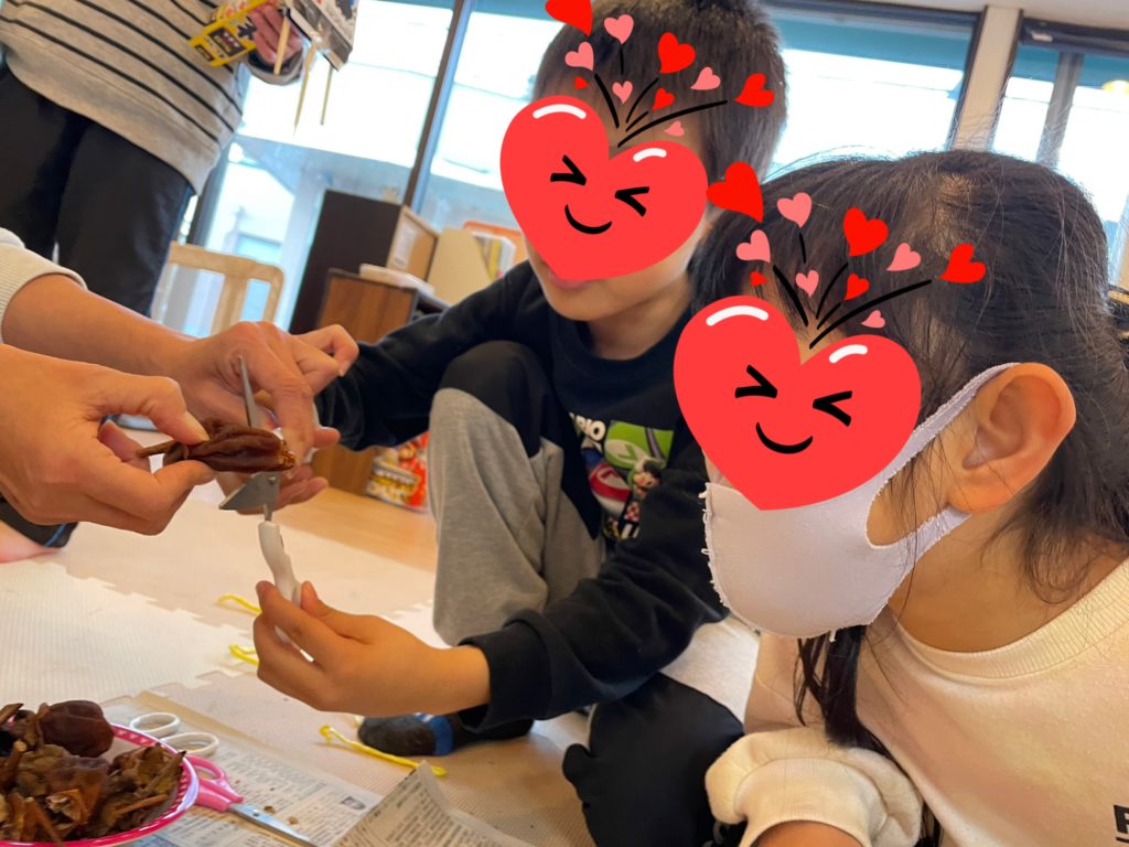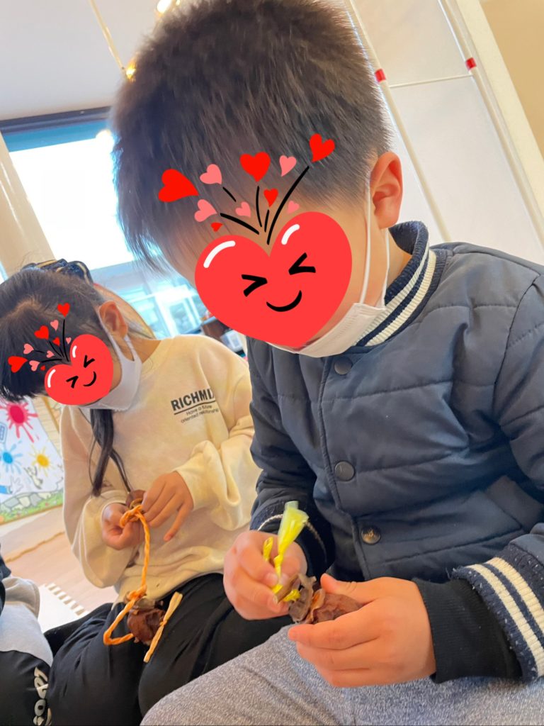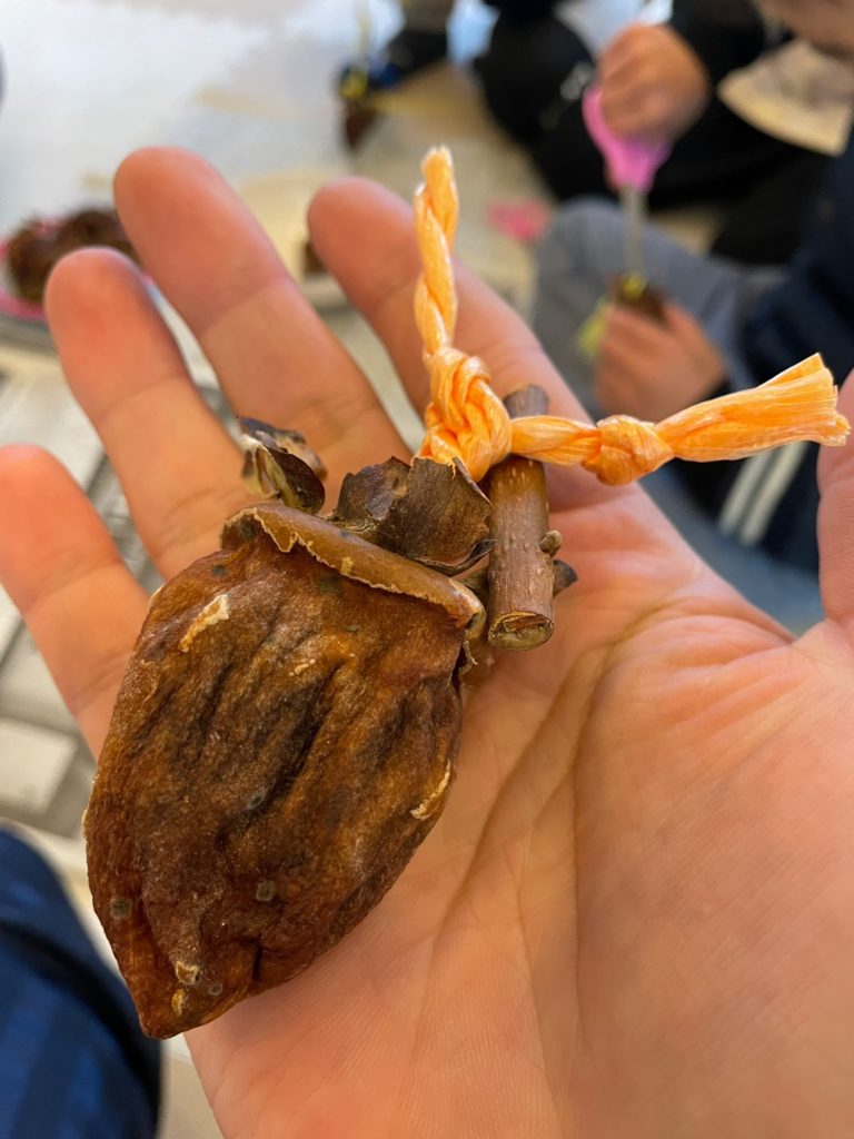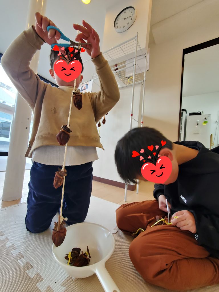11月に皮をむいてヒモで結んで玄関先に吊るしておいた干し柿が食べごろになってきたので子ども達に取ってもらいました😚しわしわで固くなり少し黒くなっている柿に戸惑いを見せながら。。😅小さく切って「食べれるんだよ」と渡してみると、においをかいで「うわっくさい~食べられへん💦」ゆっくり口に入れて味を確かめながら「けっこう食べれるで~😀」そんな様子を見ていた子が「ボクも食べてみる」といろんな姿を見ることが出来ました😆