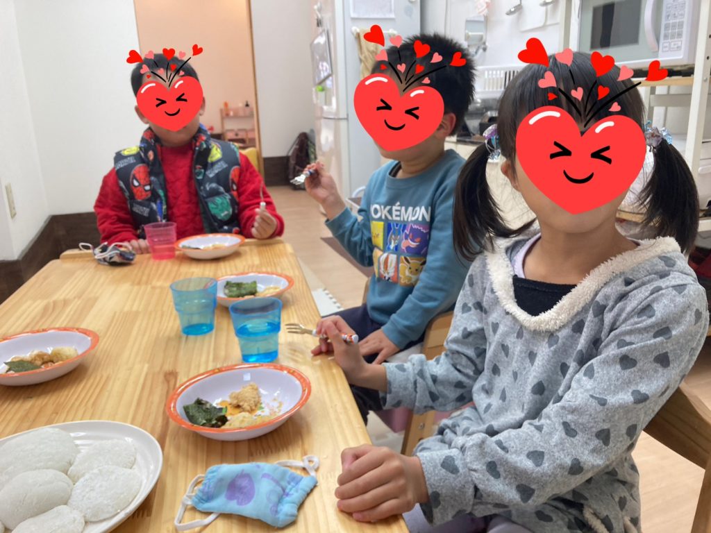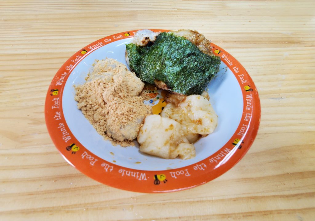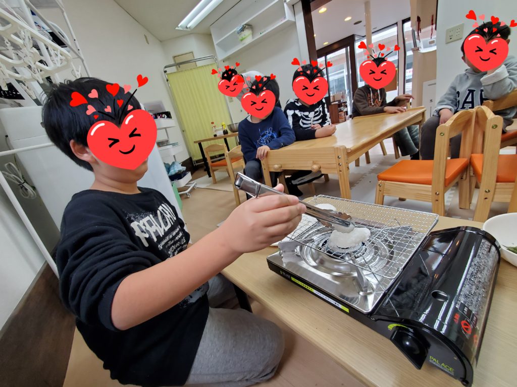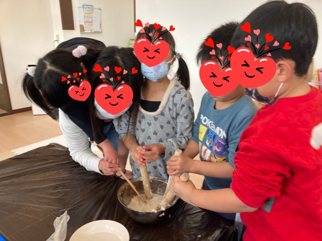 年末最後のゆうはおもちつきで締めくくりました😀杵と臼ではなくボールと麺棒を使って炊飯器で炊いたもち米をつきました😆一斉についたら粘りがでてきてあっという間におもちになりました!冷めないうちに丸めた後カセットコンロに網を置き弱火でゆっくり焼きながら砂糖じょうゆを塗ってのりを巻いたら出来上がりです😚同時進行でおろしポン酢味ときな粉味も作りました~😊みんなおもち大好きでした(^_-)-☆