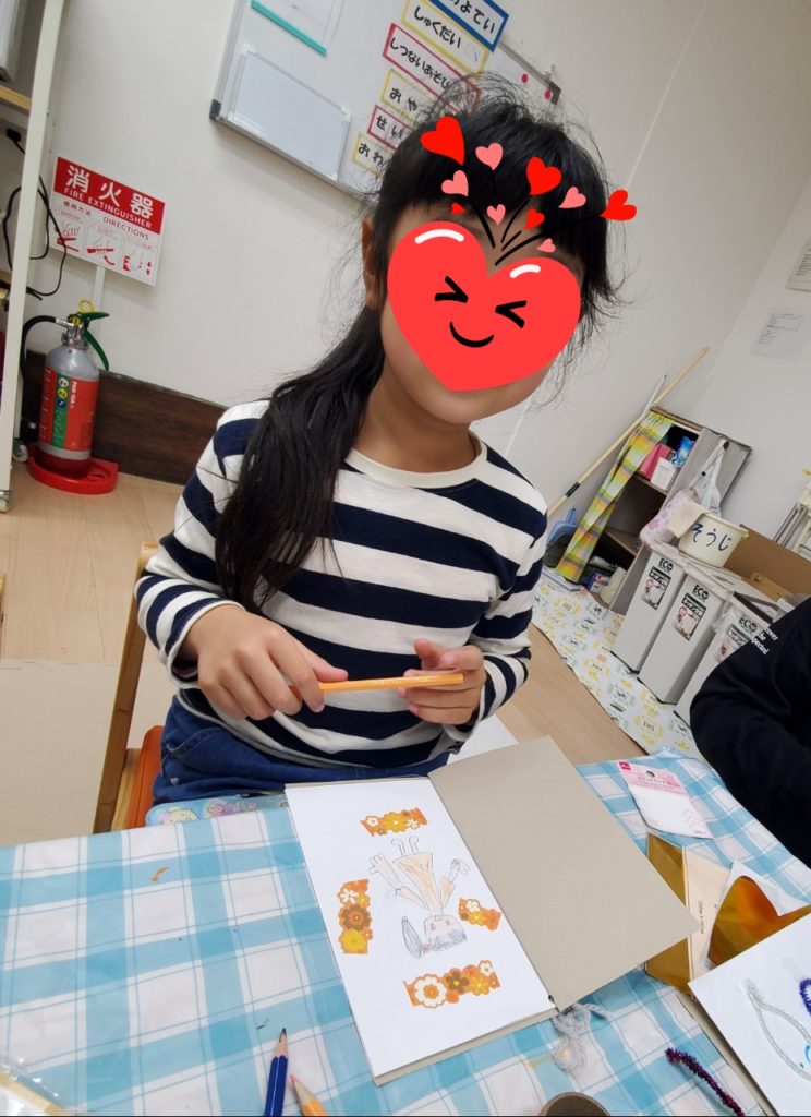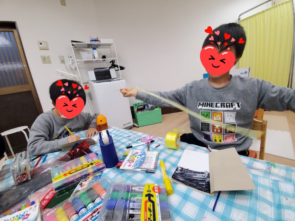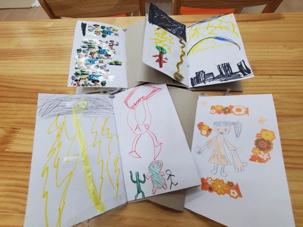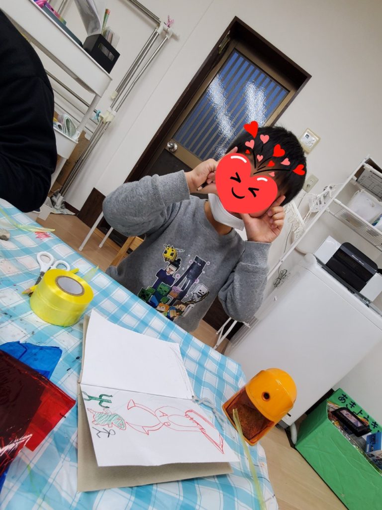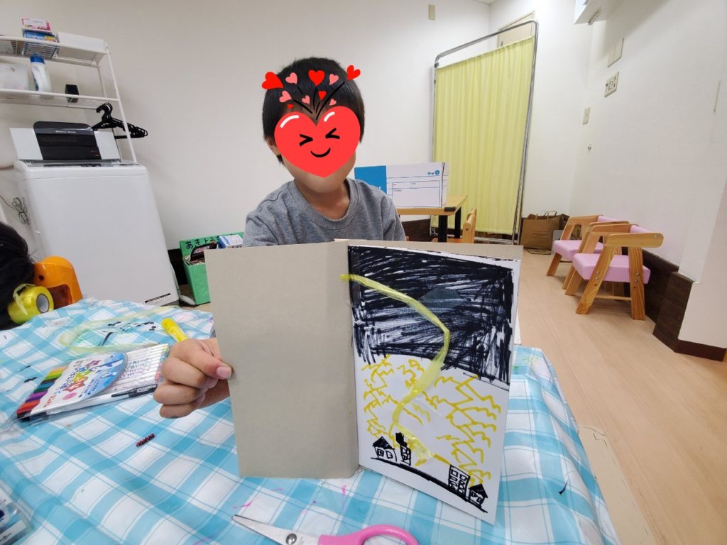2月の壁面制作スタート!小学生のおともだちが白紙の本にたくさんのペンと工作道具を使ってオリジナルの絵を描いてくれましたー😄
