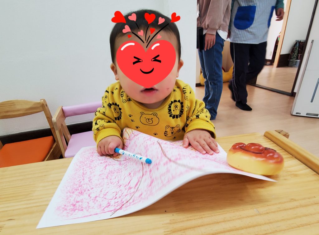 つい先日までハイハイしていた赤ちゃんもイスに座ってお絵かきのまねっこ出来るようになっています(#^^#)