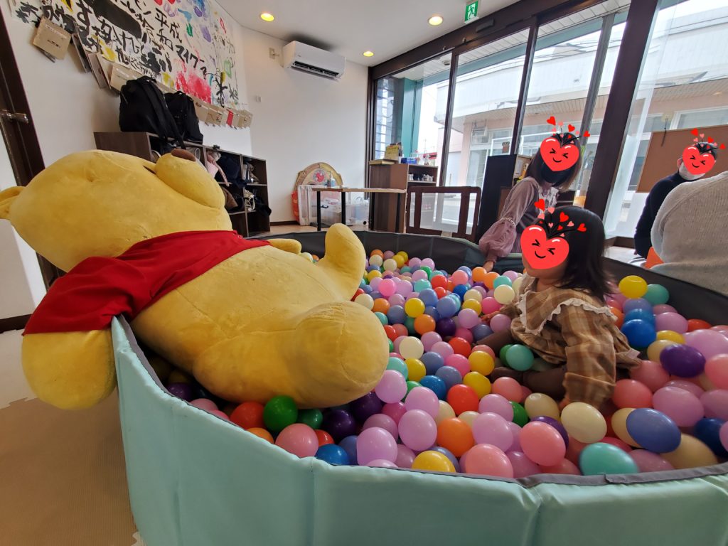 ボールプールに大きなプーさんと一緒に入ってお腹をポンポンしながら仲良く遊びました(^^♪