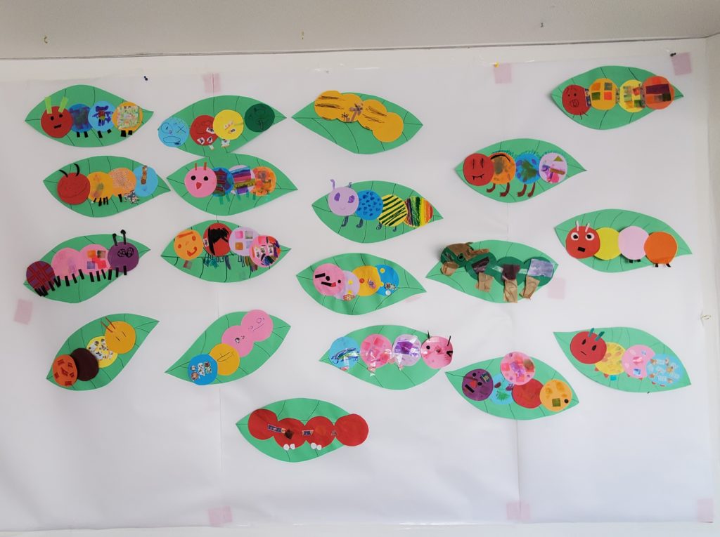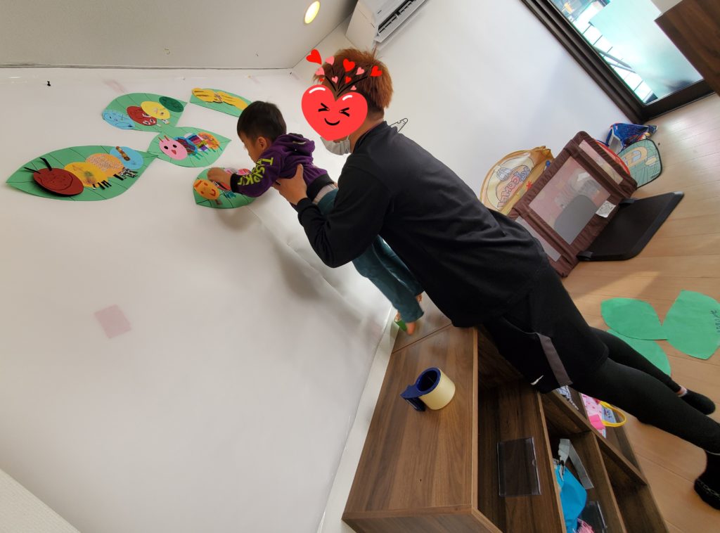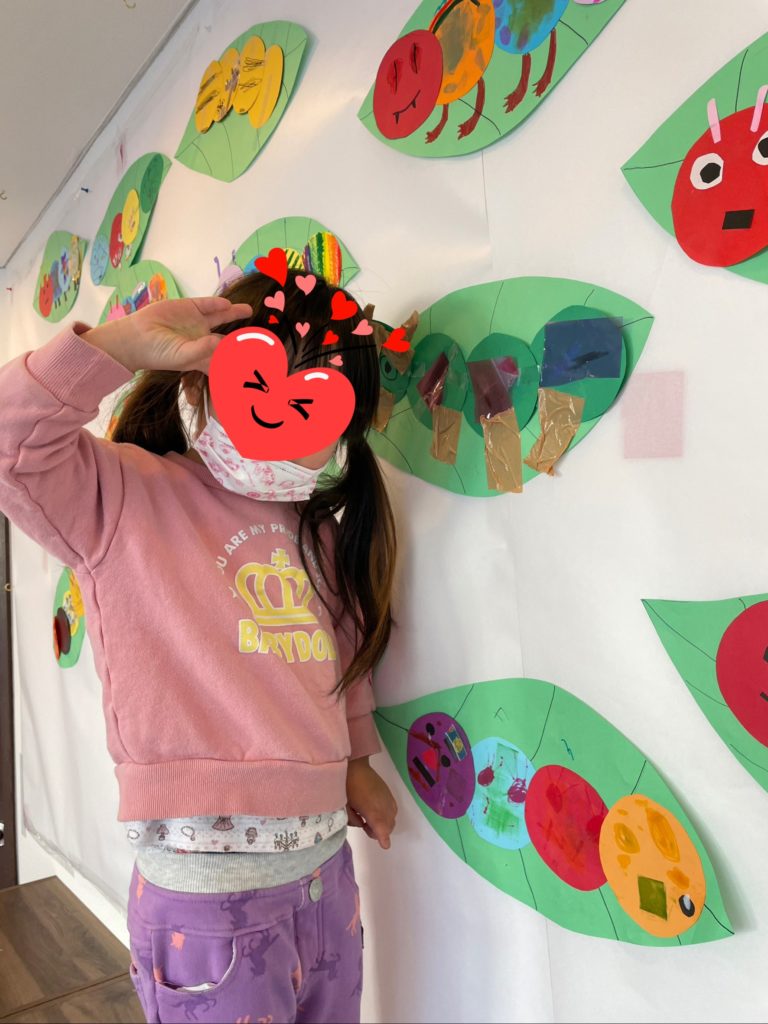 3月の壁面「あおむしさん」が完成しました!想像力をふくらませながら4枚の丸い画用紙に顏・触角・体の模様・足を描いたり貼りつけて葉っぱの上に乗せました😚たくさんのあおむしさん達が「春はそこまで来てますよ~🌹」とお知らせしてくれています😊