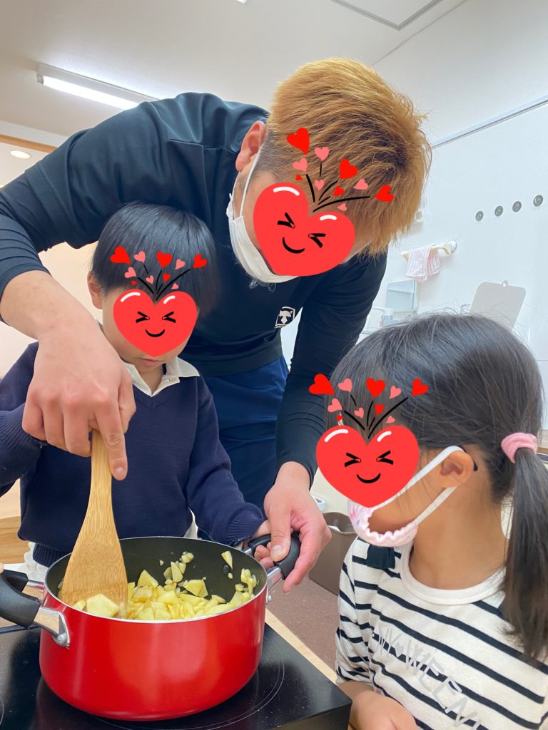 小さい子達にリンゴのコンポートを作ってもらい、餃子の皮で包む時はフォークを使いました。きつね色に揚げたら「あつあつアップルパイ」の完成です~😊