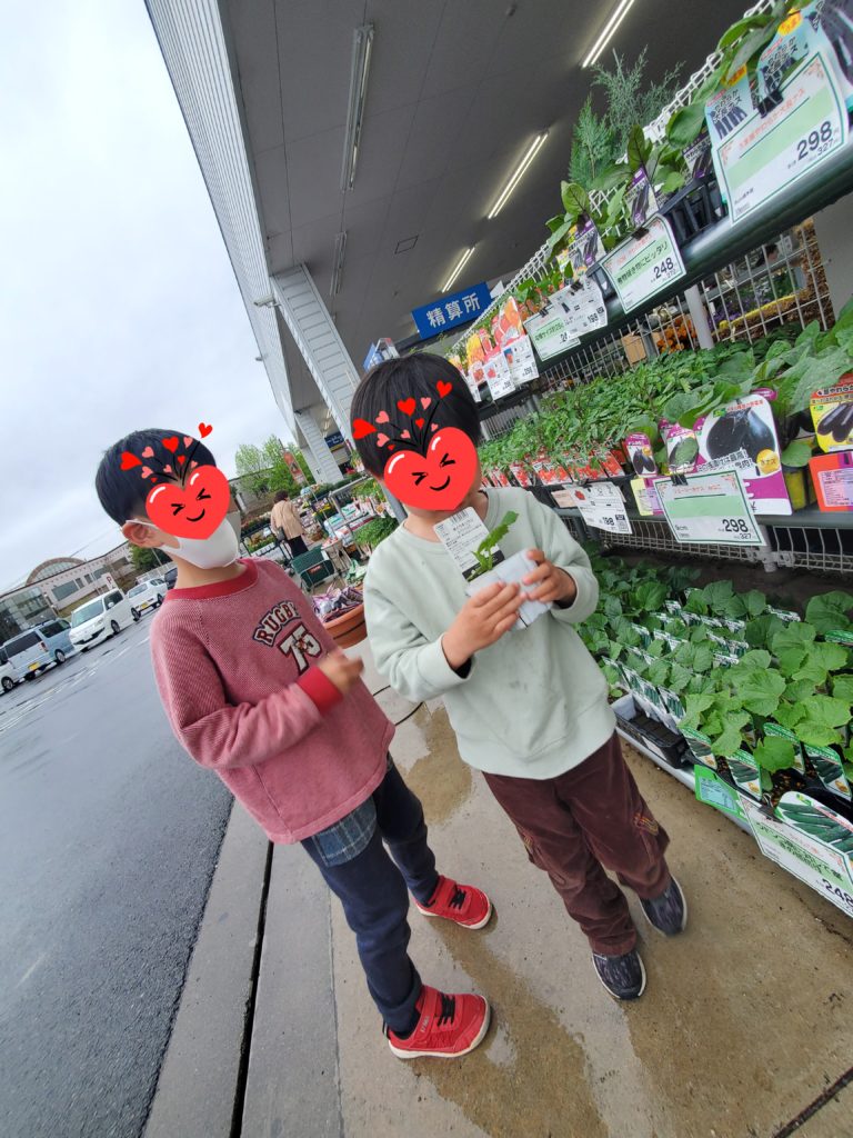 「買い物体験」で野菜の苗を買いに行きました🚗1人1苗で選ぶようお願いすると、サッと第一印象で手に取る子やゆっくり全部見てから決める子、それぞれ選び方は違いますが。。。今年の夏までゆうで育てる野菜はキュウリ🥒プチトマト🍅ピーマン🫑アスパラガス🌵に決定しました🙋
