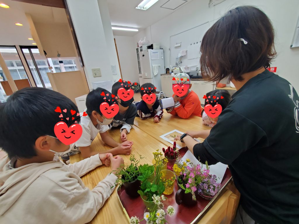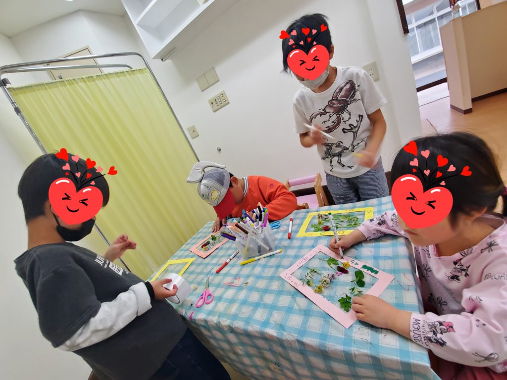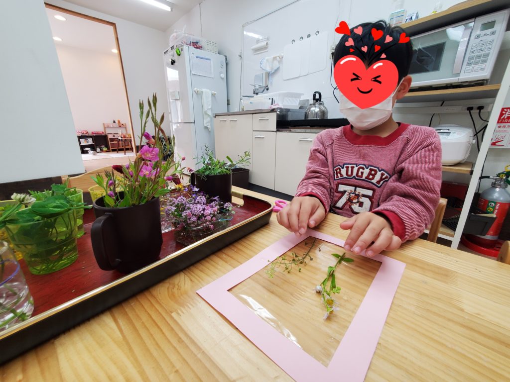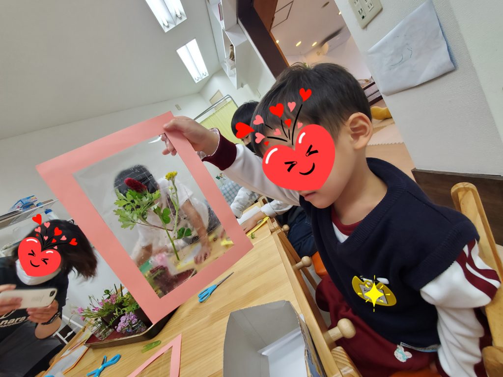 制作で「押し花作り」をしました🌹🌼🥀職員さんが春のお花をたくさん摘んできてくれました(ありがとうございます🙇)さっそくみんなでどれにしよっかお花を選んでシートに置いたら上から全面をテープで貼りつけます。枠の部分には好きな絵や字を描いてもらいました🙋自信作が完成したら「ママに見せるーー!」と嬉しそうにリュックにいれていた子ども達でした🤭