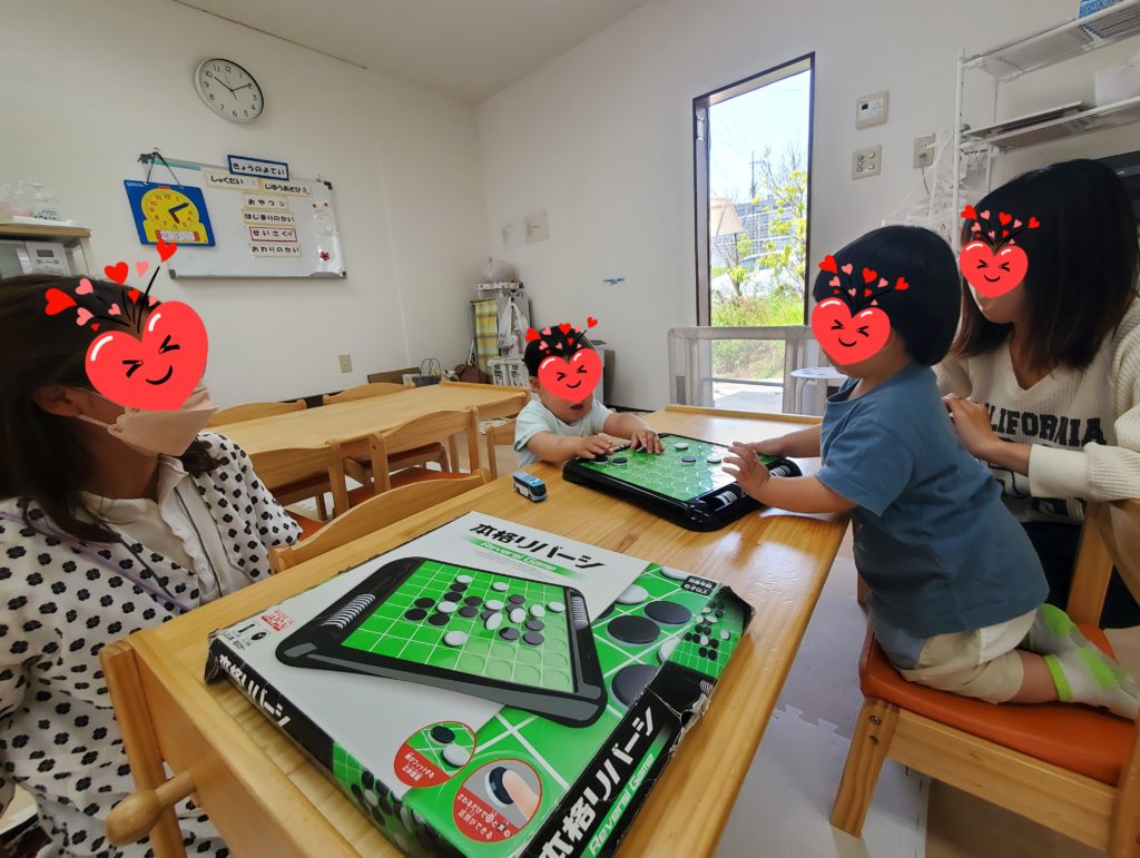 5月1回目のみんなのひろばが開催されました😊オセロで駒をパチパチ置いたり、どーぞ!ありがと!したり、投げたり、ケースにないないしたり、いろいろな遊びをしました😄