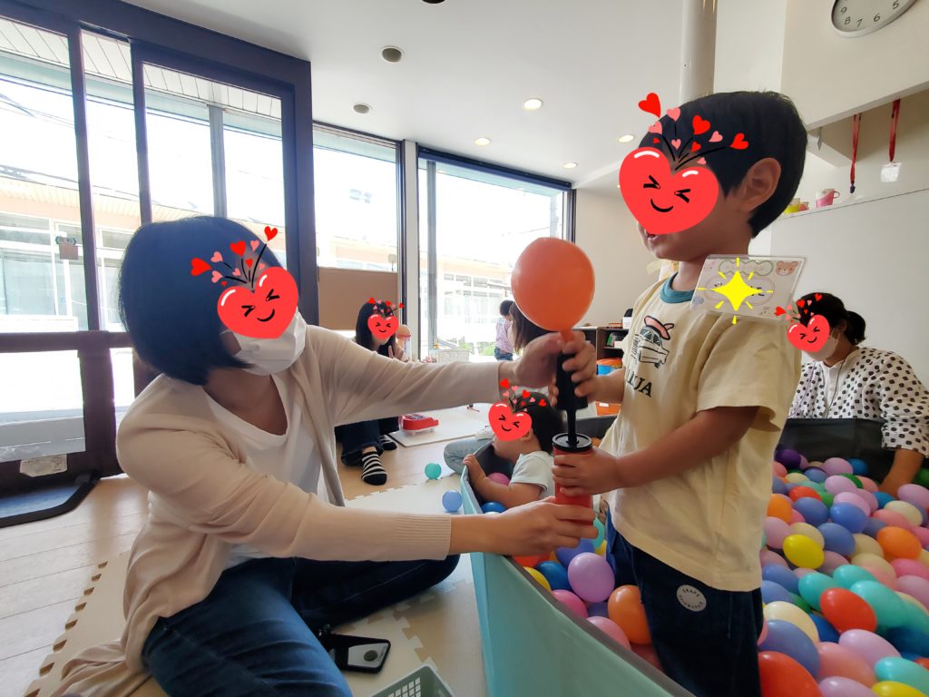 ポンプで風船に空気を入れて手を離したらシュルルル~っとあっちこっちに飛んでいって「はっしゃ~~!」「やった~\(^_^)/」と何回も飛ばして遊びました😄