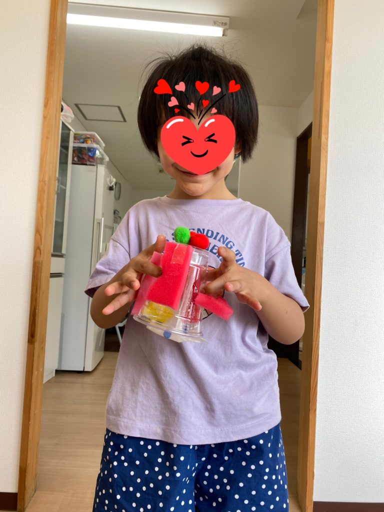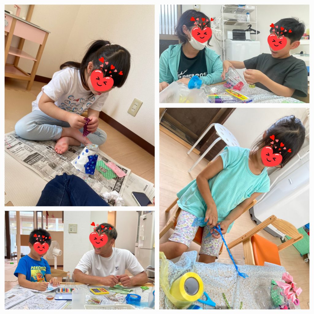 7月の壁面「ひまわりクジラと風鈴」が完成しました🐋🎐赤・青・黄色の絵の具を混ぜ合わせたら緑・オレンジ色になりました。クジラさんの枠の中に上手に塗れています~😙自由に素材を選んでプラコップにくっつけて真ん中に鈴をつけたらオリジナル風鈴の出来上がりです😊