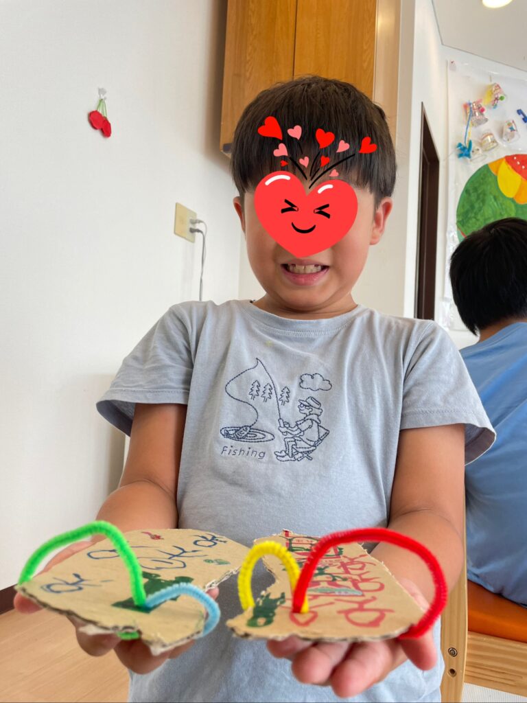 まずは制作から(^^♪「段ボールビーチサンダル」⬅️自分の足型を切って絵を描いてモールを差し込みます。結構人気で違う日に利用のおともだちも作りたい!って取り組んでいました🩴