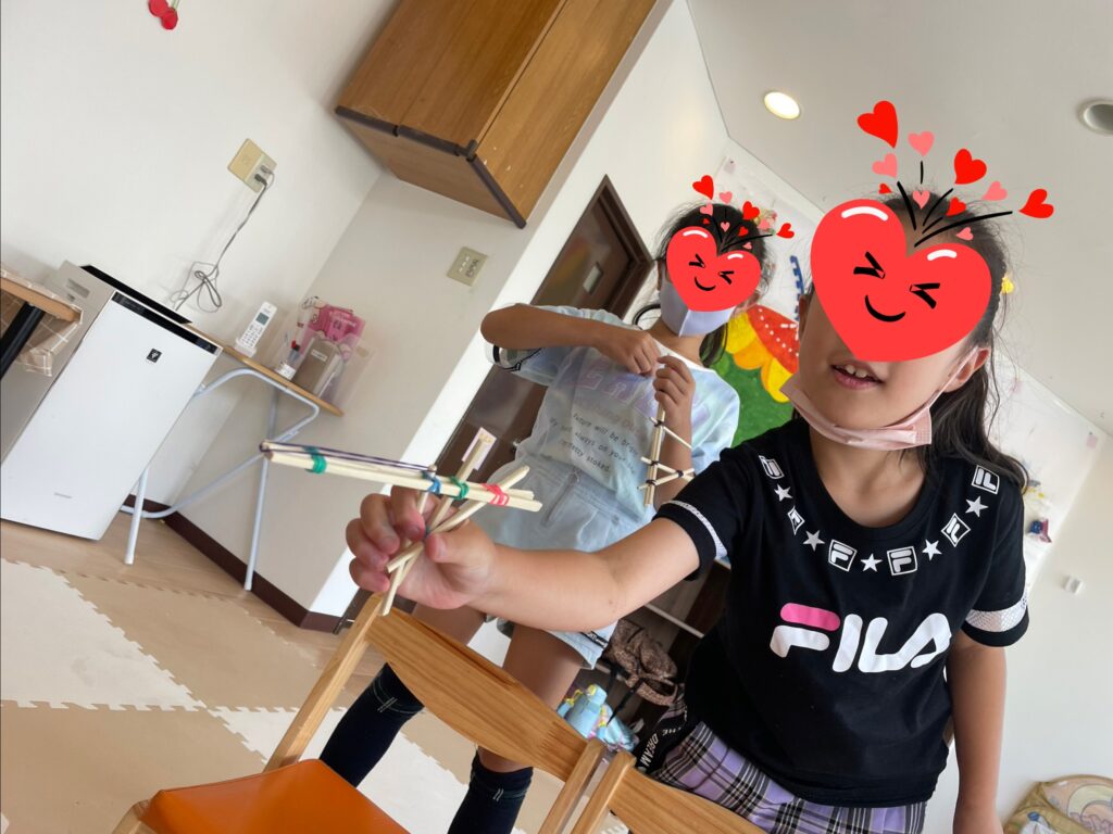 「割りばしてっぽう」⬅️ゴムをひっかける先っぽと引き棒の調整をみんな工夫していました。的を並べてお祭りの音楽をかけると射的屋さん風になって楽しめました🏮