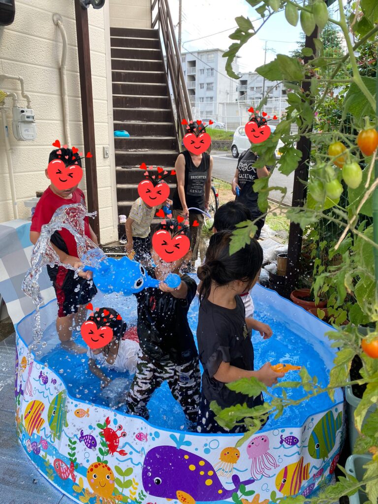 暑い日が続く時はミニプールでたくさん濡れるのが一番😝ジョウロや水てっぽうでいっぱいかけあいました🔫職員さんがホースでシャワーにして上からかけると「キャーッ💦」「つめたい~💦」とめっちゃ良い笑顔😄みんなプール大好きです😍