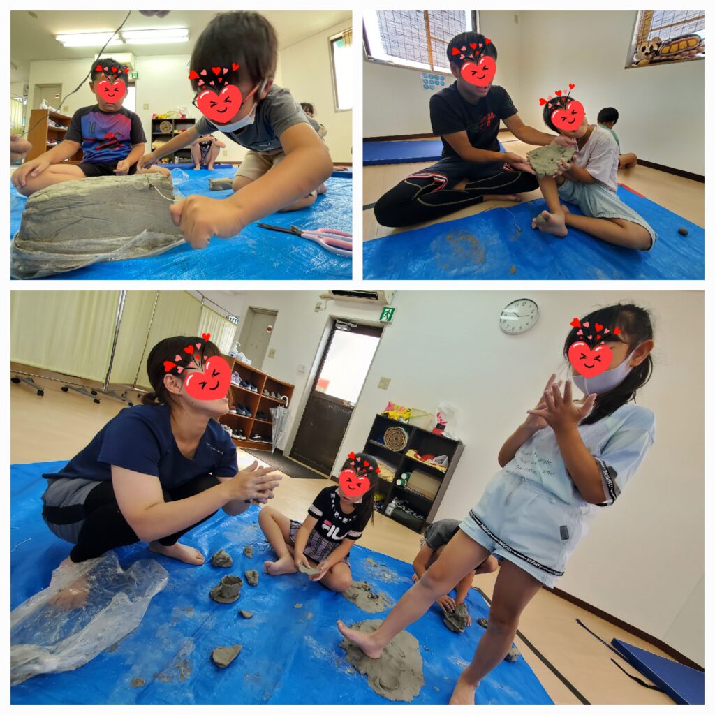 「土ねんどで遊ぼう」⬅️大きなかたまりの土ねんどを素足で踏むと「冷たくて気持ちいい~!」と感触を楽しんだり、手型足型・好きな物を作って遊びました✋