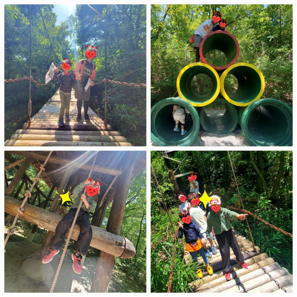 森に探検に出かけました🌳🌳🌳グラグラ揺れる吊り橋を恐くないように手をつないで渡りました。大きな土管の一番上まで登りきりました。木で出来たお家に入って空を見上げました。日常とは違う建造物は楽しくって刺激があふれています⭐