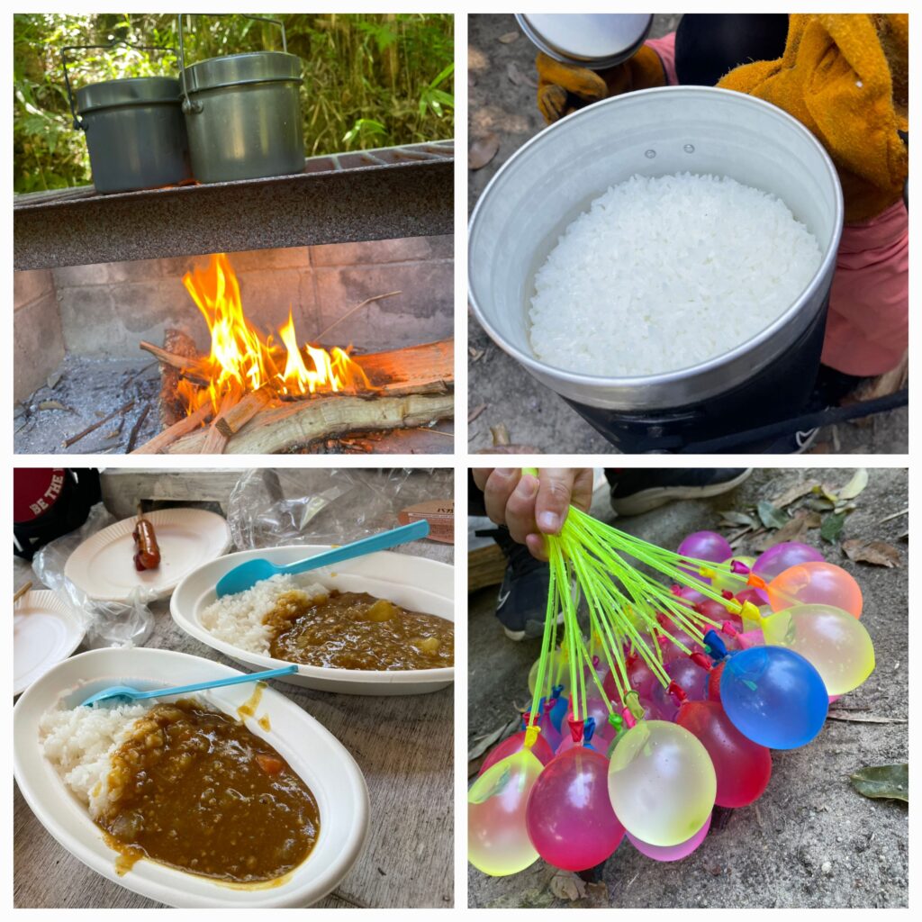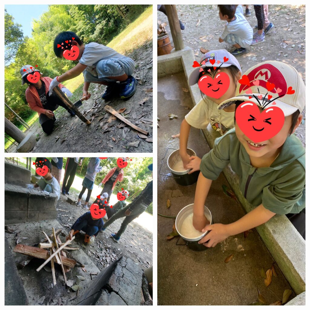 まずは飯盒炊飯からスタート!ナタで太い薪を縦に割って細い木にしましょう🪓周辺に落ちてる小枝もたくさん集めてね😙お米は飯盒の中で洗いましょう🍚メモリを見ながら水の量をはかってね😙かまどに薪を組み終わったら、いよいよ点火🔥!!初めての飯盒炊飯はとっても貴重な体験になりました⭐
