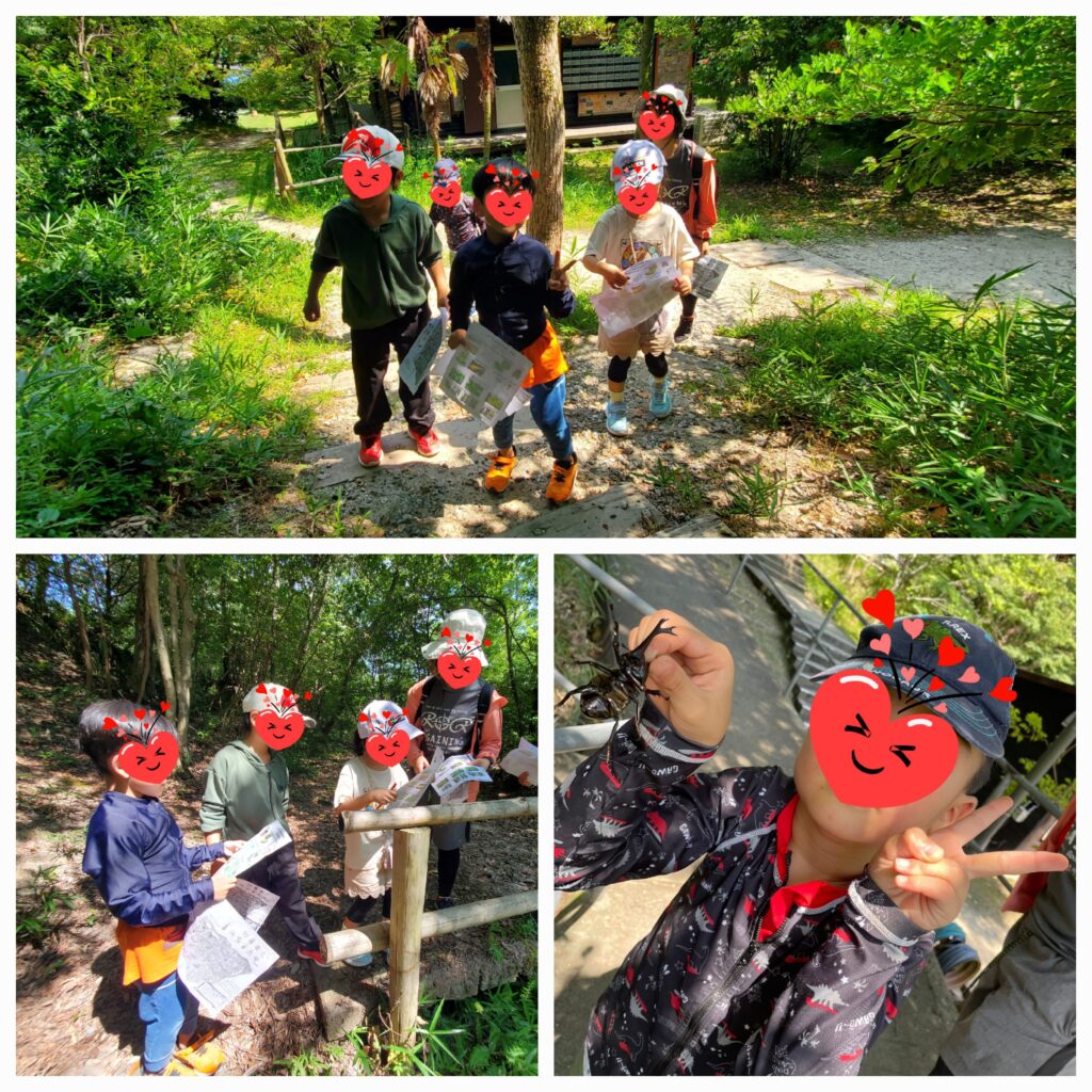 再び森の中へ。。今度は「自然宝さがしゲーム」です✨職員さんから渡された問題の用紙には鳥の声・ピカピカの虫・トゲトゲした葉っぱ・髪の毛みたいな木など色んな生き物や植物のヒントが書かれていましたよ~。いざ探しに地図を持って出発です!よ~く耳を澄ましたりじっくり見てみると・・「あったー!!」と一人の子が見つけて「どこどこー?」とみんなが集まってきてペンでしっかりチェックです⭐