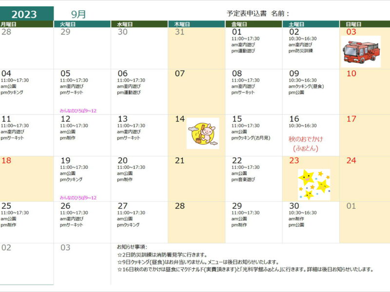 9月の予定表が出来ました😄消防署見学と秋のおでかけに行きますよ~🚒⭐まだまだ暑い日が続きますが、とっても暑い時は無理せずお部屋で過ごしましょうね😙